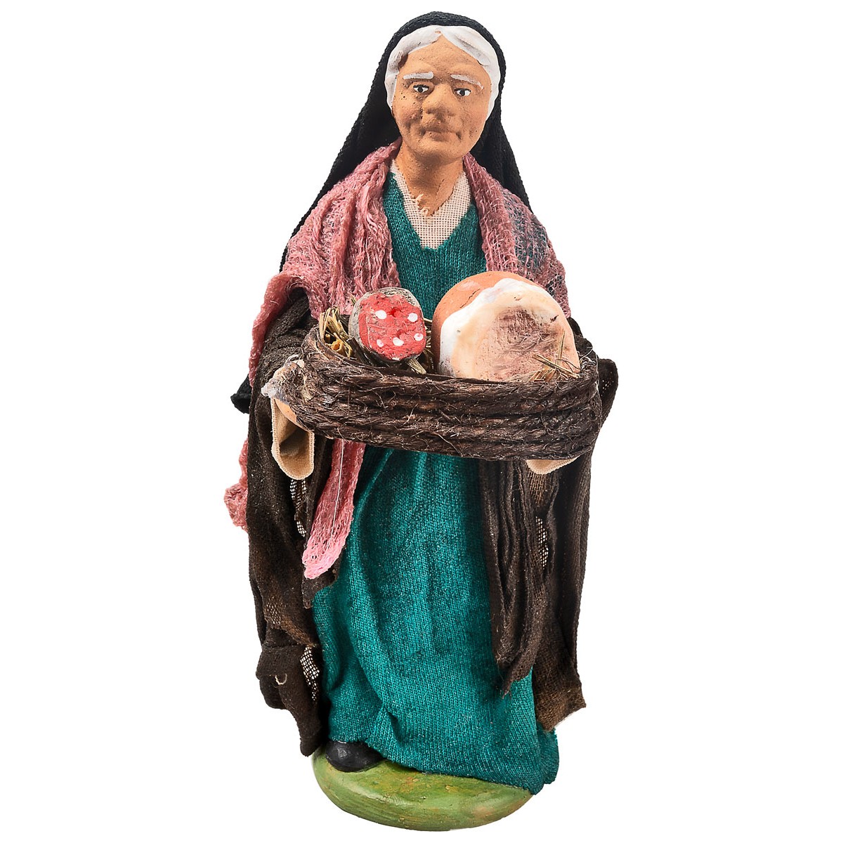 Mujer en terracota 12 cm en estilo árabe-palestino con cesta de jamones en las manos, vestida con ropa de tela endurecida.