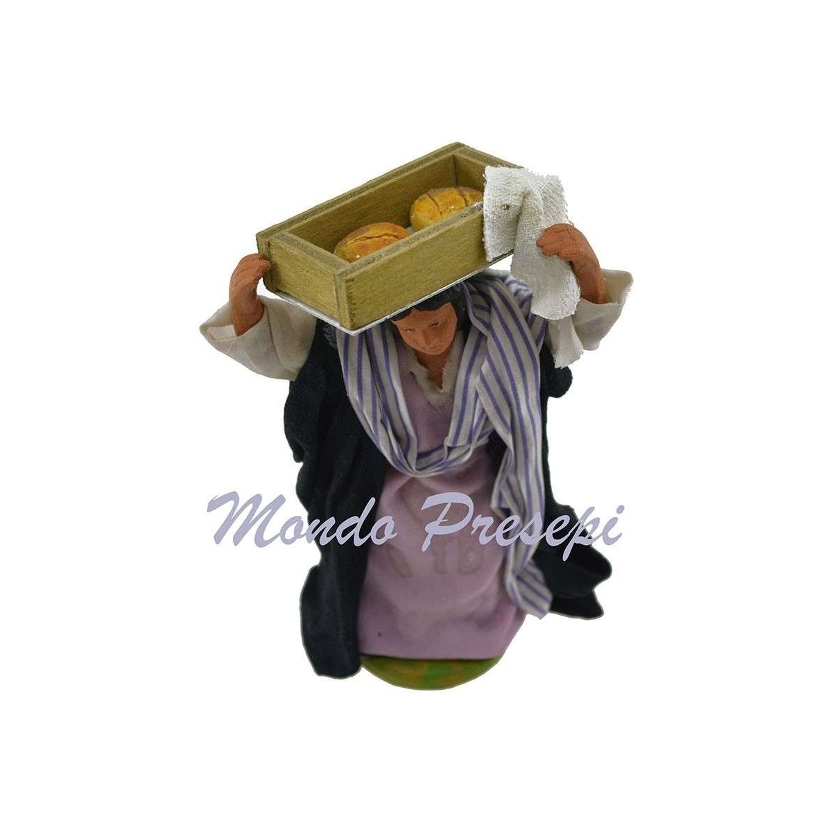 Mujer con caja de pan sobre la cabeza, estatua de terracota artística acabada en los detalles y vestida con tela endurecida.