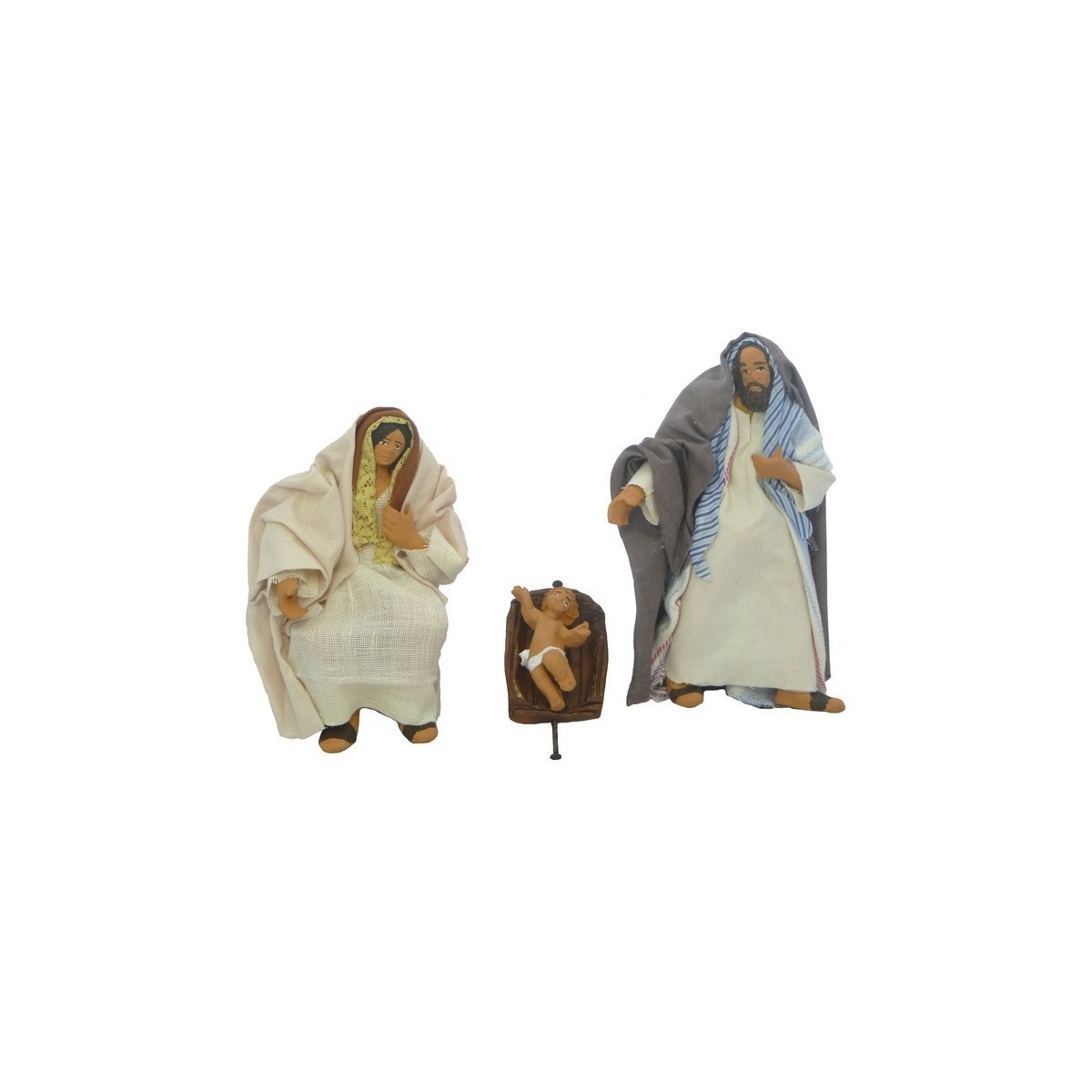 Grupo Natividad serie 15-16 cm en terracota vestida en tela y articulada para movimientos, compuesta por San José (se puede inclinar o mover la linterna), la Virgen María y Jesús separado de la cuna (preparada para el movimiento donde se puede enganchar el brazo de María). Las estatuas son ideales para la realización de movimientos para el belén DIY o para ser utilizadas fijas y colocadas en la posición deseada. El artículo está completamente hecho a mano, por lo tanto, los colores pueden variar con respecto a la foto.