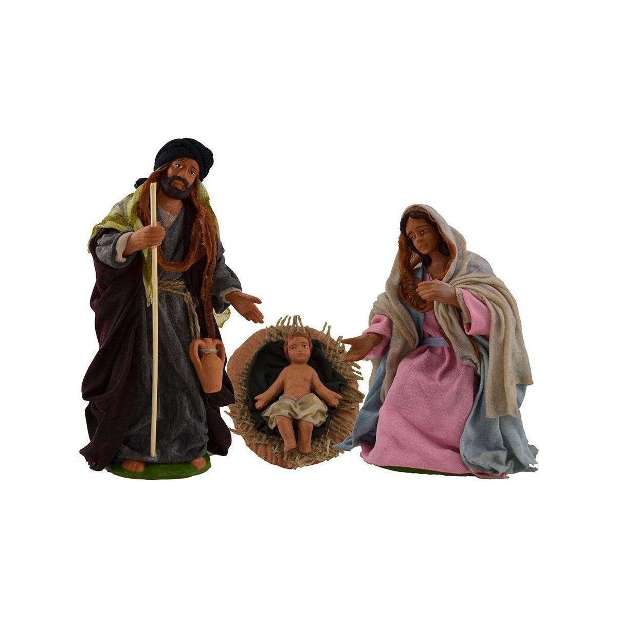 Conjunto de Natividad de terracota vestida en tela endurecida compuesto por: San José, María y Jesús en la cuna.