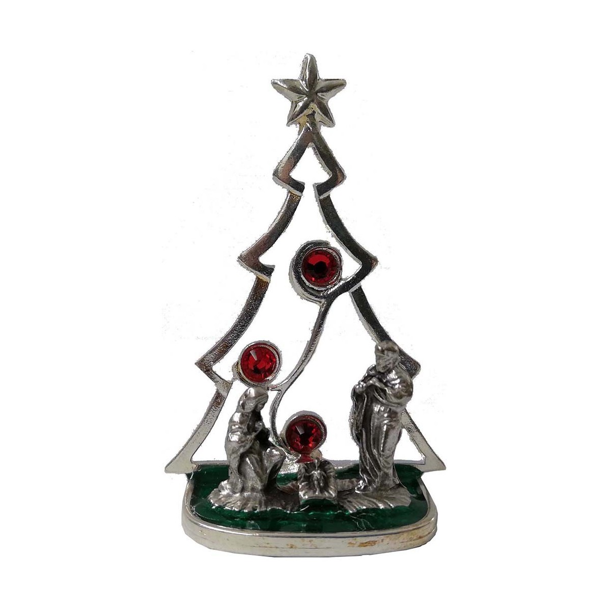 Árbol de Navidad con Natividad en metal (peltre). La escena de la Natividad se desarrolla en la base del árbol, en cuya cima se encuentra una estrella. El fondo está adornado con piedras rojas.