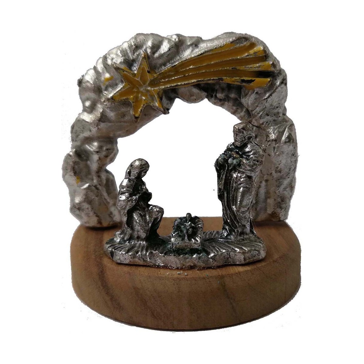 Arco con estrella cometa y Natividad en metal (peltre) sobre base de madera.