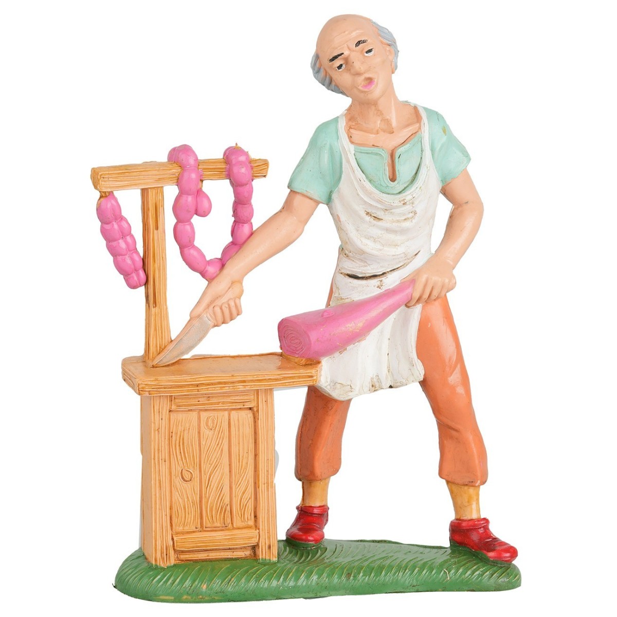 Charcutero con mostrador de embutidos de altura 15 cm. La estatua está realizada en PVC y producida en Italia.