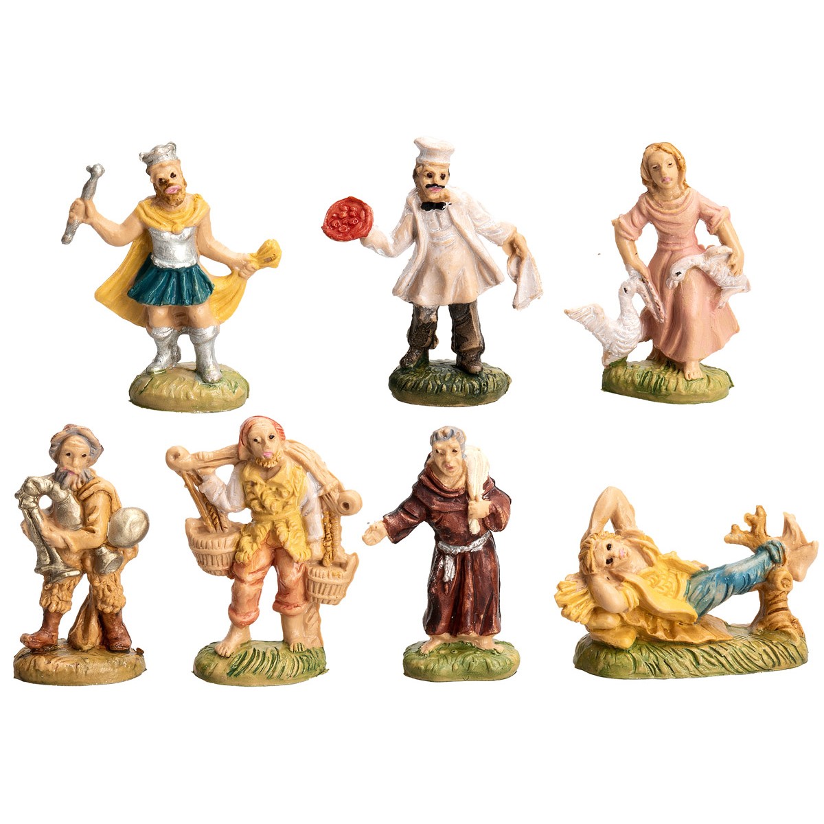 El conjunto incluye varios personajes tradicionales del belén, entre los que se encuentran oficios populares, figuras femeninas y masculinas en varias poses, junto con el clásico durmiente.