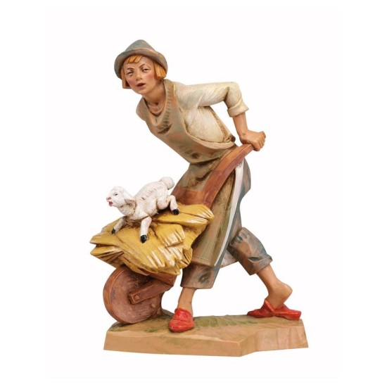 Campesino con carretilla de heno y oveja serie 19 cm Fontanini pintado a mano. Las estatuas del pesebre tradicional Fontanini tienen rostros expresivos y bien acabados en los detalles.