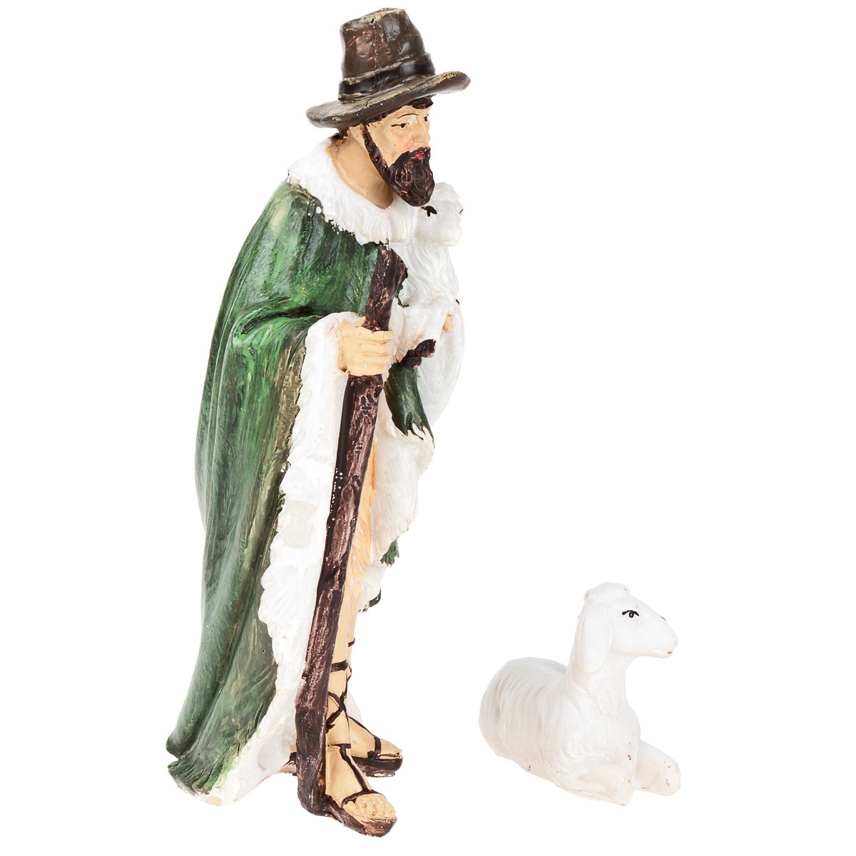 La composición incluye a San José, María, el Niño Jesús, el asno, el buey, una oveja, el Buen Pastor, el Ángel y los tres Reyes Magos.