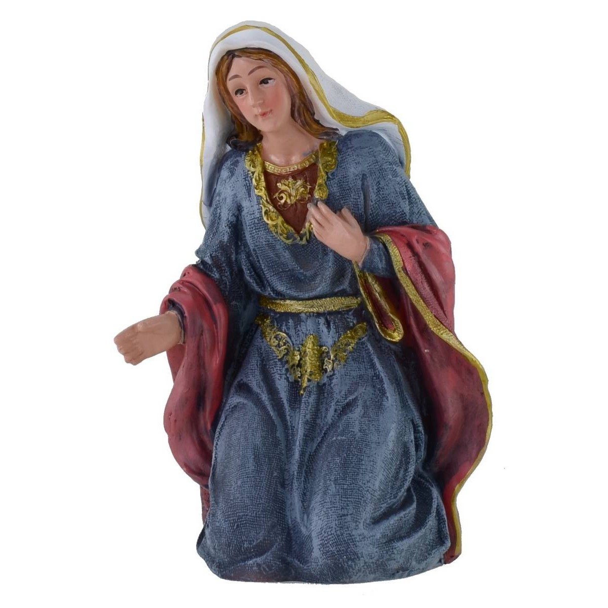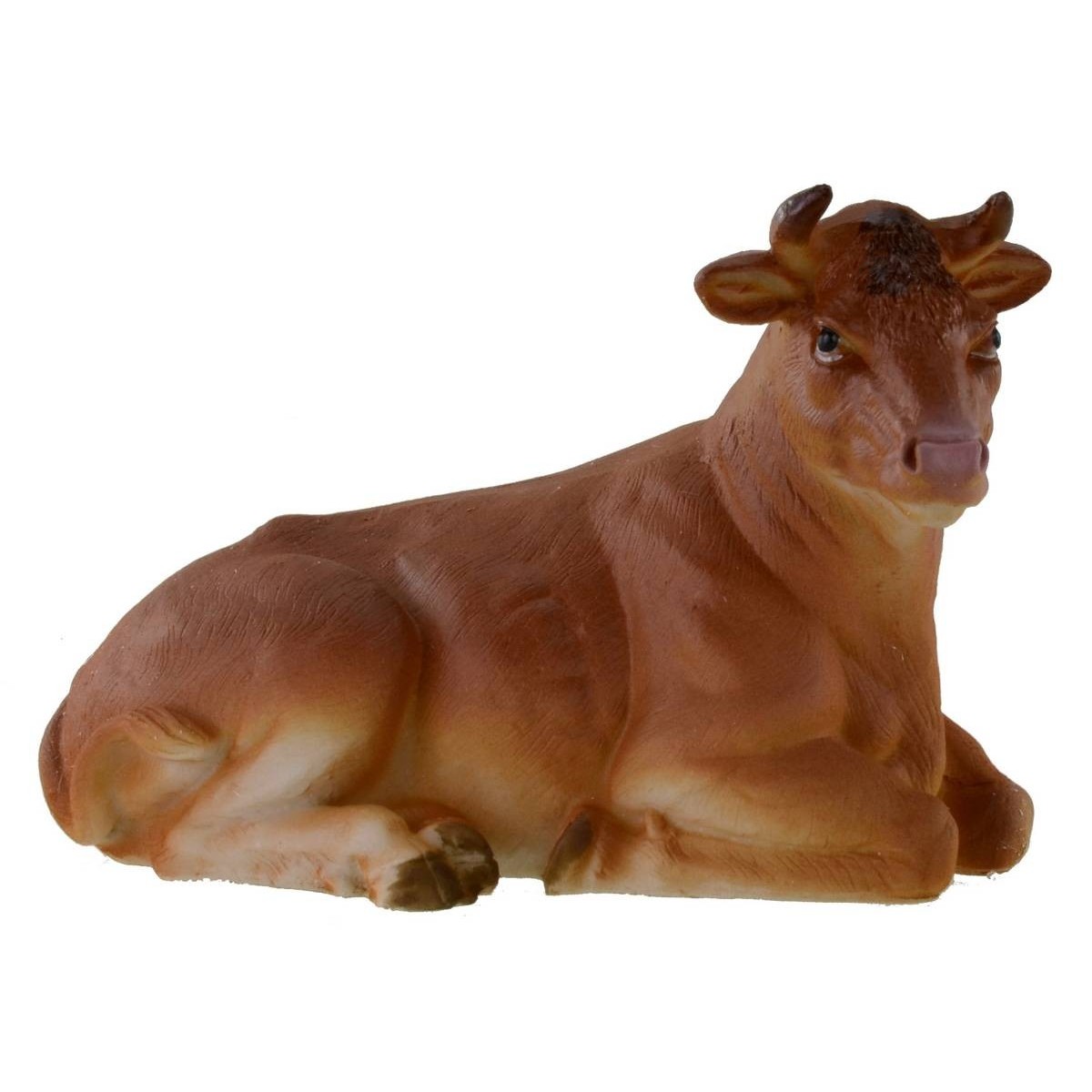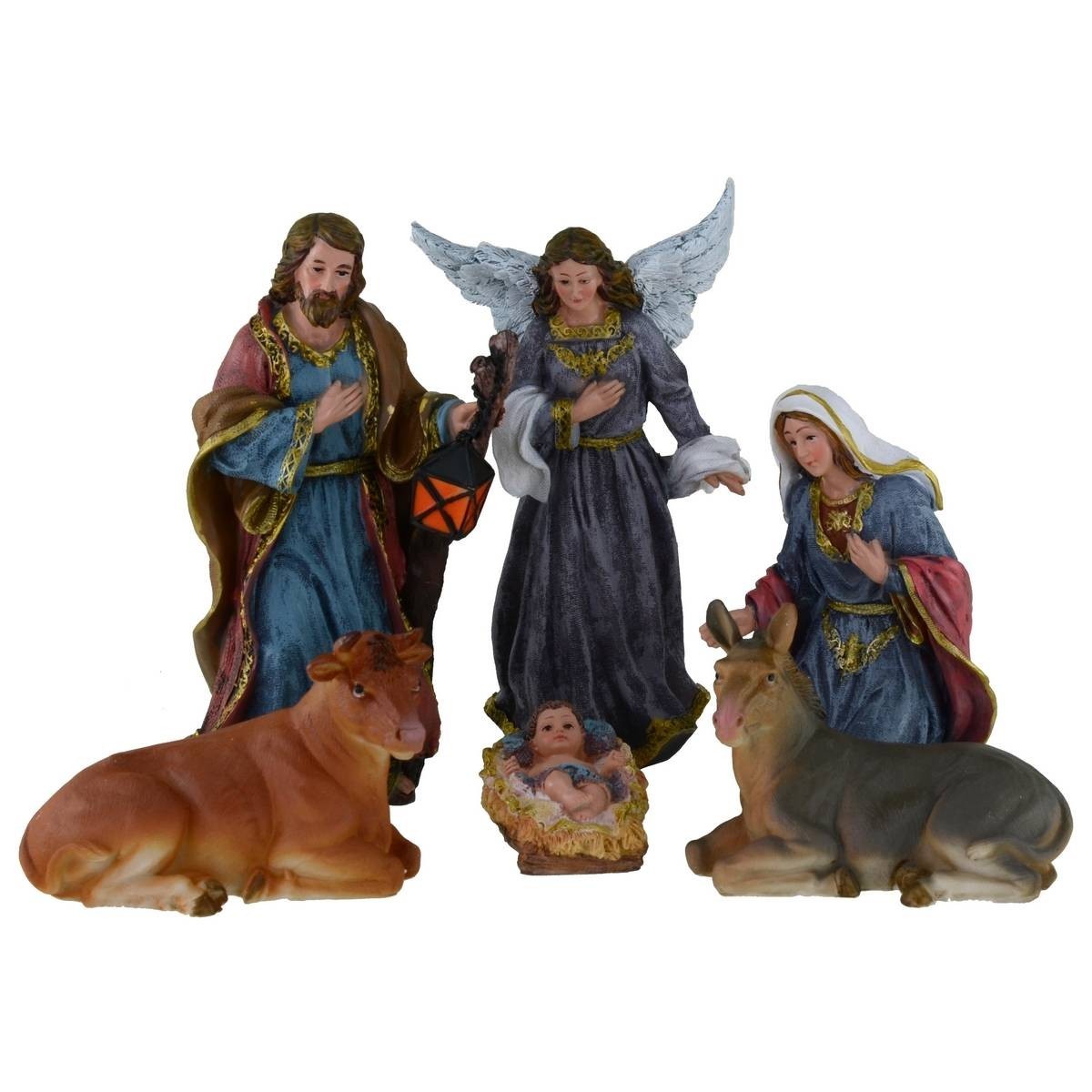 Natividad en conjunto de 11 piezas, compuesto por: San José con linterna, María, el Niño Jesús, el burro, el buey y la oveja, el pastor, el ángel y los tres Reyes Magos. Todo el conjunto pertenece a la serie de 27 cm. Se hace presente que el Niño Jesús está pegado a la cuna y no es móvil. Las estatuas están bien acabadas en los detalles: están realizadas enteramente en resina y pintadas a mano por hábiles manos artesanas. Los rostros resultan muy expresivos y detallados en los particulares.