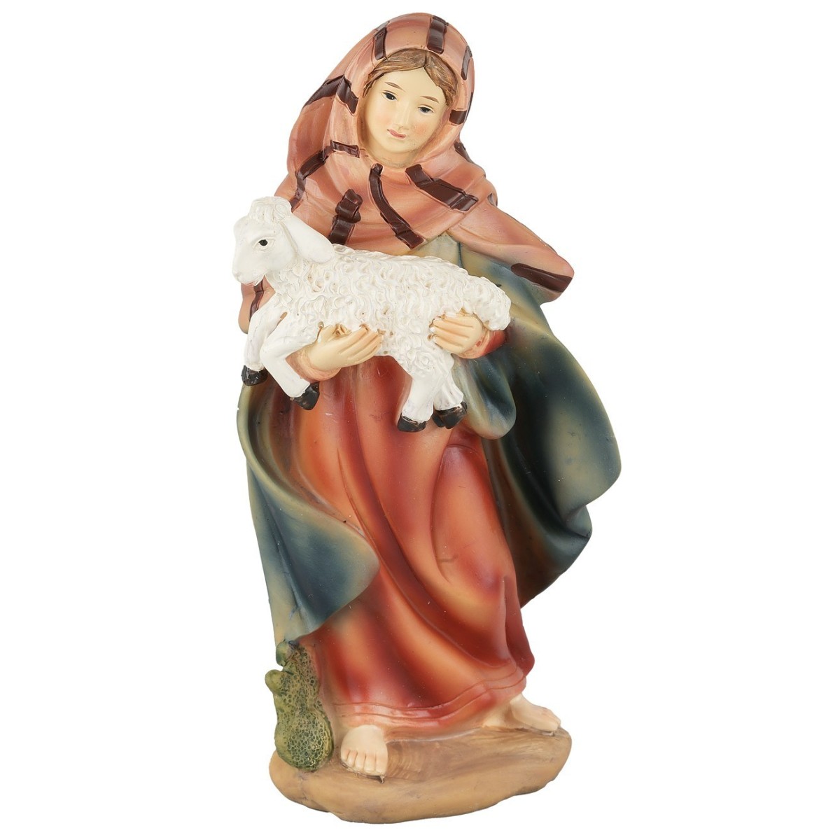 Mujer con cordero en brazos, hecha de resina. La figura se presenta bien acabada en los detalles. En los productos relacionados a continuación, es posible encontrar las figuritas de la misma línea.