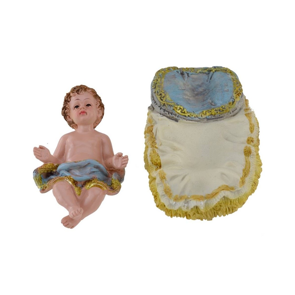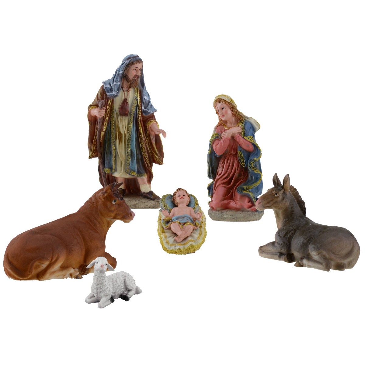 Natividad en resina compuesta por 6 figuras (San José, María, Jesús, buey, burro y oveja).