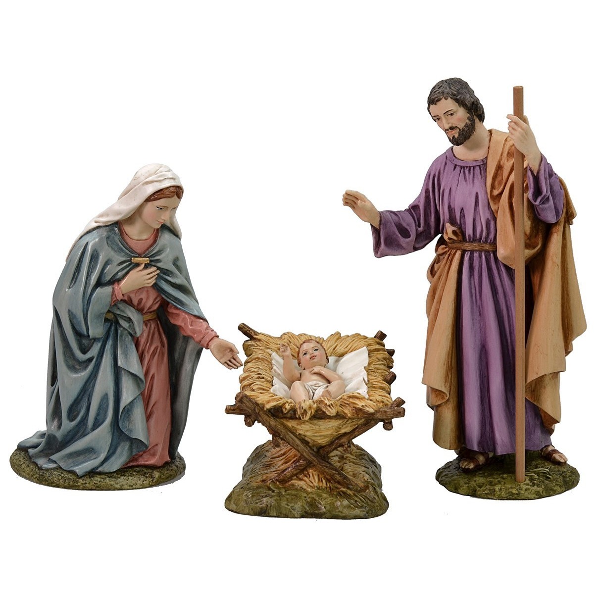 Sagrada Familia en resina serie Landi Moranduzzo 18 cm, compuesta por San José, Virgen María arrodillada y Niño Jesús en la cuna separado; estatuas hábilmente esculpidas por las manos expertas del escultor homónimo Martino Landi. Toda la serie está pintada a mano y producida íntegramente en Italia. Esta serie de estatuas para el pesebre es conocida por sus líneas armoniosas y expresivas, por los delicados matices de color que contribuyen a hacer las figuras del pesebre aún más realistas.