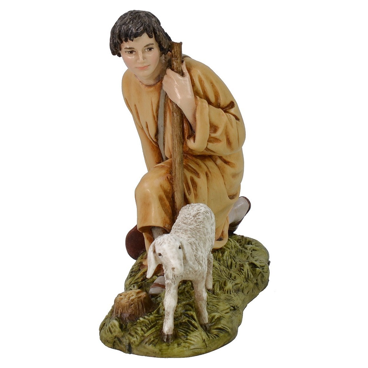 Buen pastor arrodillado, se apoya con un bastón, con la mano derecha sostiene su sombrero; frente a él se encuentra una de sus ovejas. Realizado en resina y pintado a mano, pertenece a la serie Landi Moranduzzo de 18 cm.