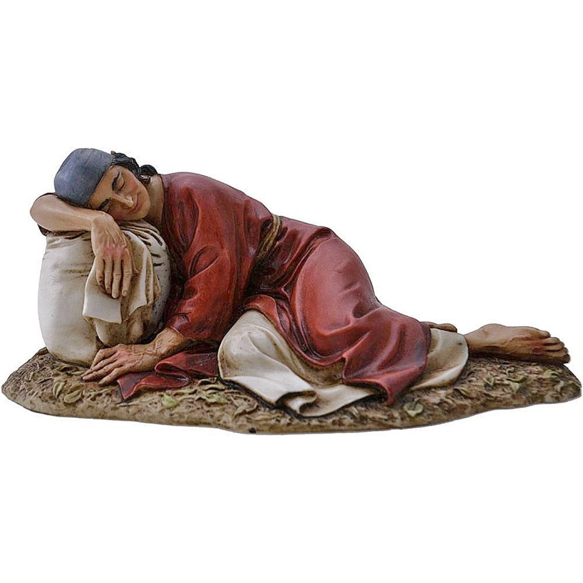 Durmiente en resina, pintado a mano serie Landi Moranduzzo 20 cm. Detrás de la figura del Benino hay muchas interpretaciones. Lo que es cierto es que se trata de una referencia a lo que se afirma en las sagradas escrituras: "Y los ángeles dieron el anuncio a los pastores durmientes". Según la tradición napolitana, el Benino (así se llama al pastor durmiente en el estilo napolitano) es quien está soñando con el belén y "¡ay de quien lo despierte! La historia y las escrituras de los evangelios nos enseñan que el pastor durmiente representa la incertidumbre de la vida; durante el sueño, el pastor sueña con el anuncio de la llegada de Dios, que representa la esperanza, la toma de conciencia de que la vida terrenal no es eterna. En nuestro sitio encontrarás disponibles las estatuas para belén de la misma serie.