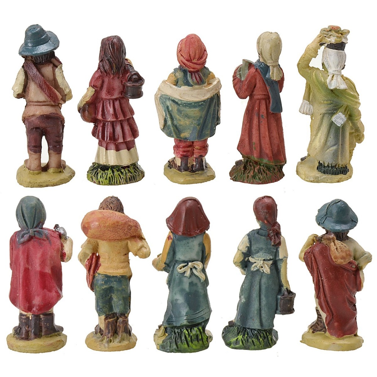 Conjunto compuesto por 10 figuras de resina de altura 5 cm: mujer con ánfora, mujer con cesta de frutas, mujer con cubos al hombro, gaitero, viajero con fardo y cordero, músico, campesina con cubo, mujer con niño, herrero y molinero con saco.