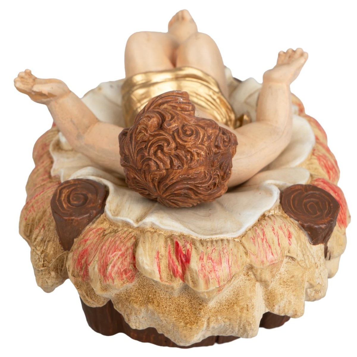 Estatua que representa a Jesús Niño acostado en la cuna, con los brazos abiertos en gesto de acogida y rostro dulce lleno de expresividad.