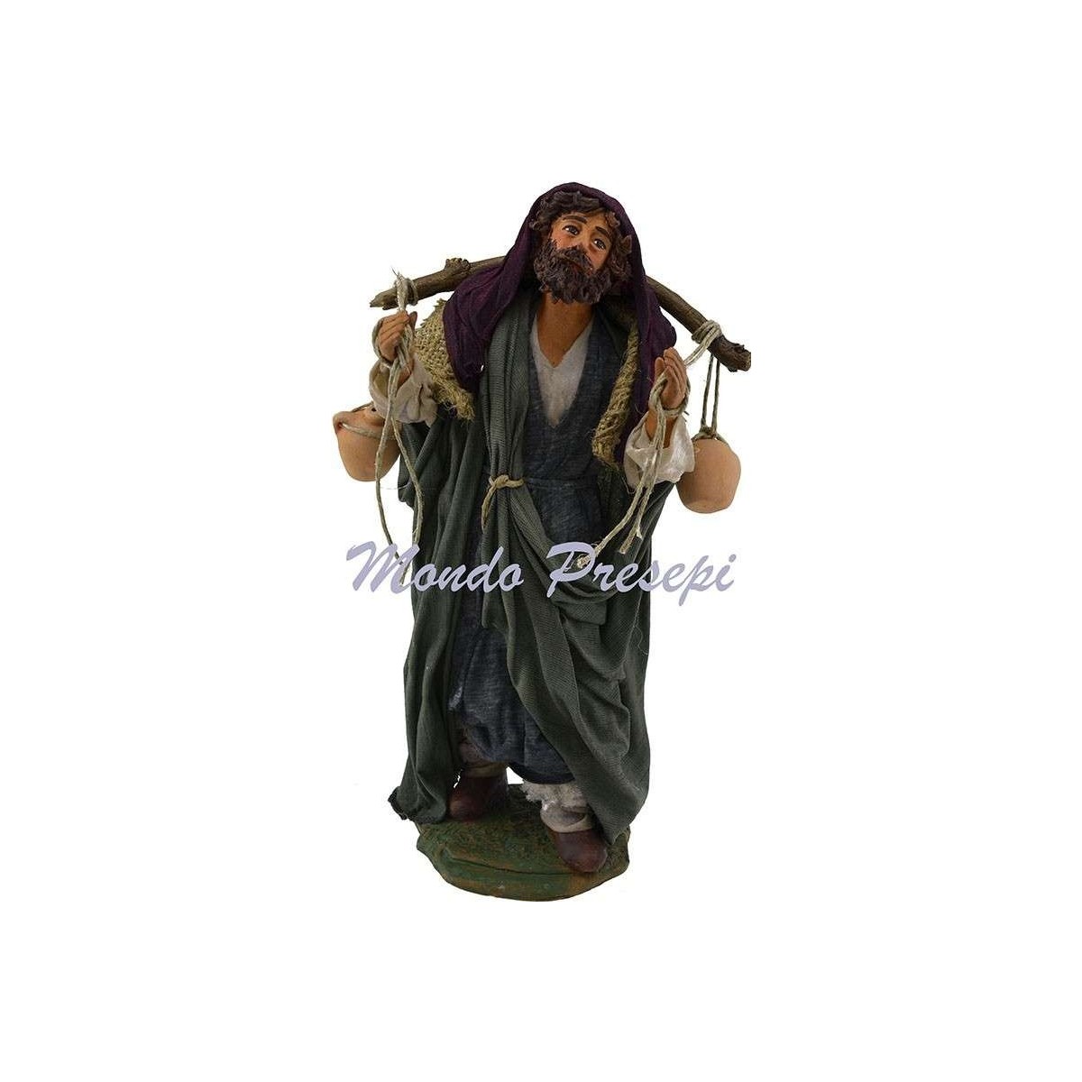Aguador con ánforas al hombro, estatua de terracota artística acabada en los detalles y vestida con tela endurecida.