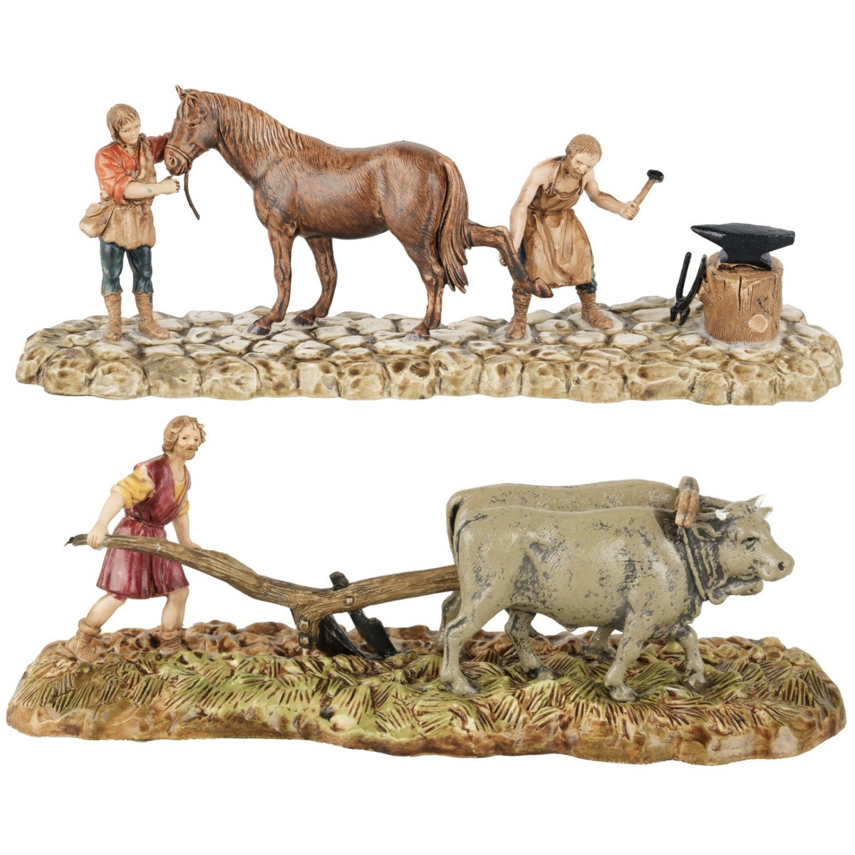 Conjunto grupo arado y herrero de la serie 6 cm, realizado en pvc. En la primera escena vemos a un hombre con arado y bueyes; mientras que en la segunda escena el herrero que está lavorando il ferro per realizzare gli zoccoli del cavallo presente. Se precisa que el tamaño real de la serie Landi Moranduzzo de la figura en posición erguida es de aproximadamente 5,5 cm. Además, las figuras Landi Moranduzzo se caracterizan por ser producidas totalmente en Italia y pintadas a mano por artesanos locales.