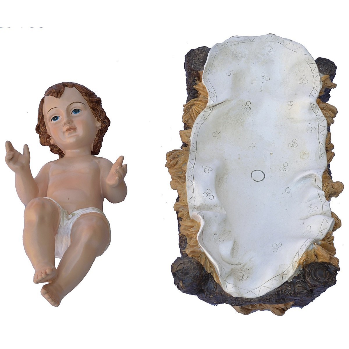 Natividad en resina compuesta por 3 figuras: San José con bastón y linterna, María arrodillada con los brazos cruzados y el niño Jesús. Las estatuas están bien acabadas en los detalles, realizadas completamente en resina y pintadas a mano. Se precisa que Jesús es móvil, por lo tanto, puede estar o no colocado en la cuna.