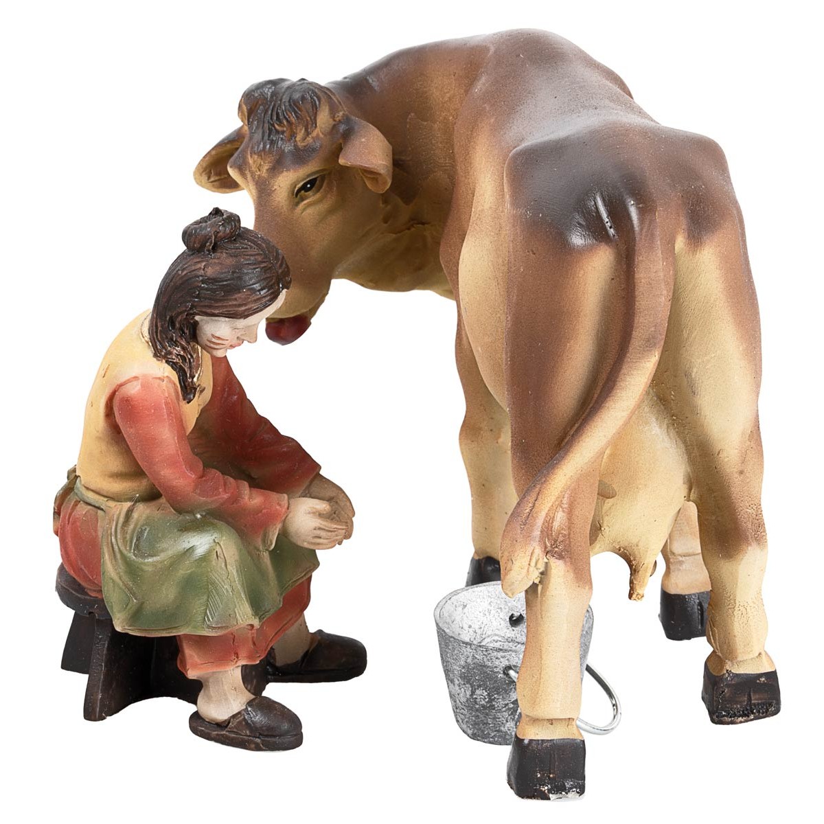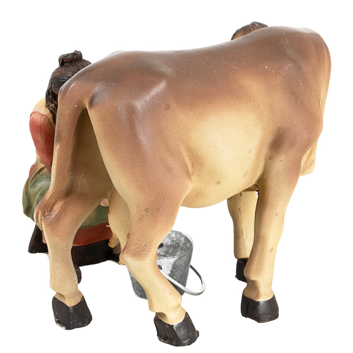 Escena de ordeño compuesta por la mujer sentada en el taburete ordeñando la vaca con el cubo de aluminio para recoger la leche. Los dos sujetos son de resina, las expresiones y los colores otorgan gran veracidad a la escena.