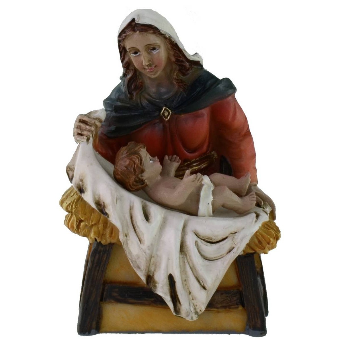 Sagrada Familia compuesta por 3 figuras (Virgen María, San José y el Niño Jesús) en resina serie 10 cm. Se hace presente que el Niño Jesús está separado de la cuna, que en cambio es un bloque único con la Virgen María.