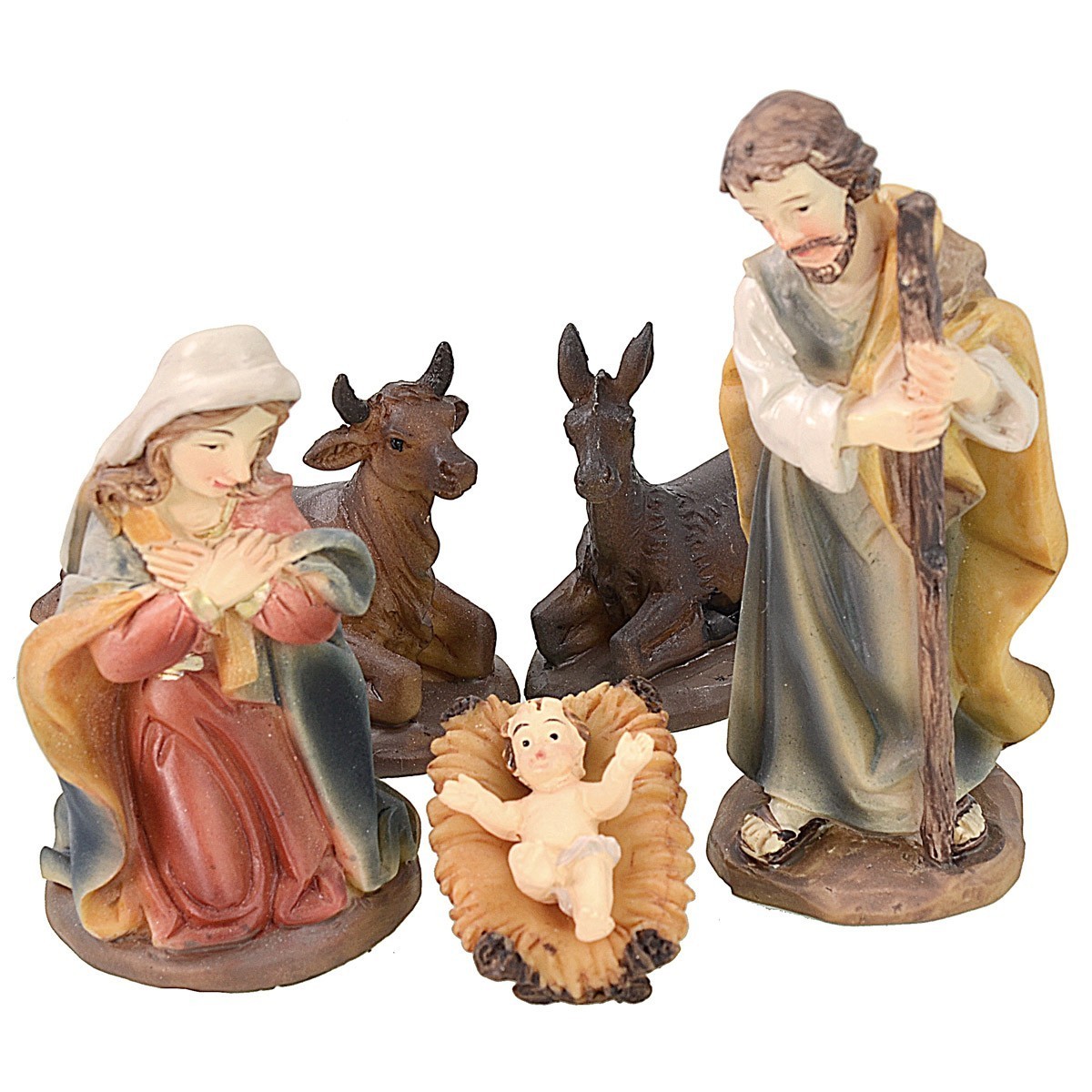 Natividad en set de 11 piezas, compuesta por: San José, María, el Niño Jesús, el asno, el buey y la oveja, el Buen Pastor, el Ángel arrodillado y los tres Reyes Magos. Todo el set pertenece a la serie de 7 cm. Se hace presente que el Niño Jesús no está pegado a la cuna, sino que es móvil. Las estatuas están bien acabadas en los detalles: están realizadas completamente en resina y pintadas a mano. Los rostros son muy expresivos y detallados en los particulares.