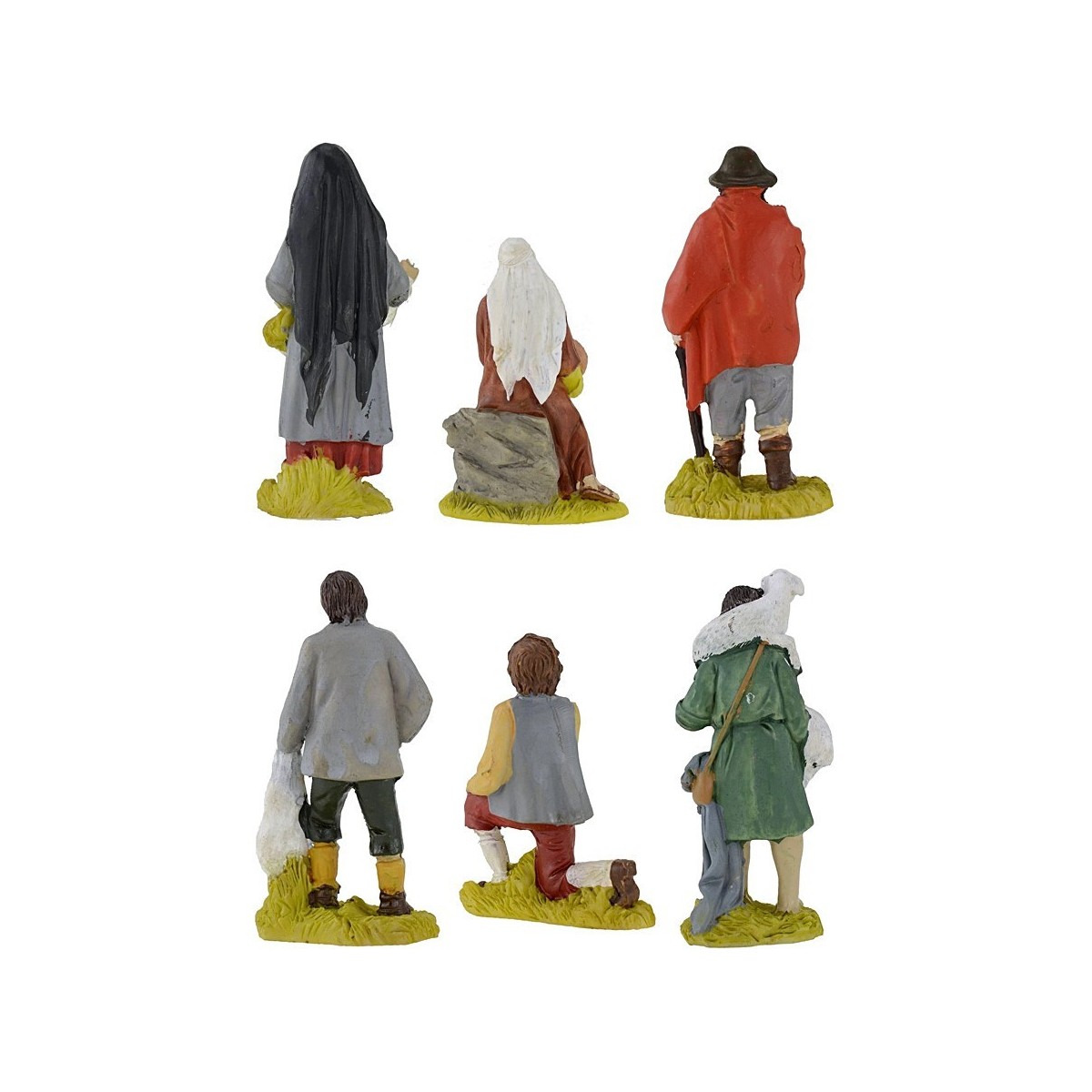 Set compuesto por 6 personajes de resina de altura 9 cm: campesina, vendedora sentada, hombre con bastón, vendedor de telas, chico arrodillado y pastor con corderos.
