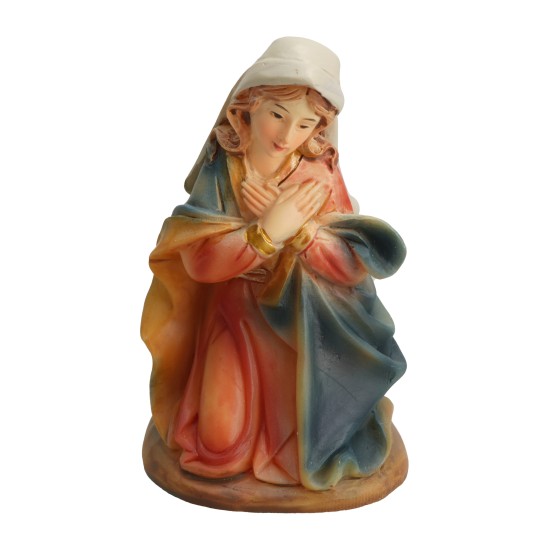 María arrodillada en resina de la serie 9 cm. La figurita representa a la Virgen en oración con las manos cruzadas sobre el pecho, vestida con manto azul y túnica roja. Ideal para completar la Natividad o como figura individual dentro del pesebre.