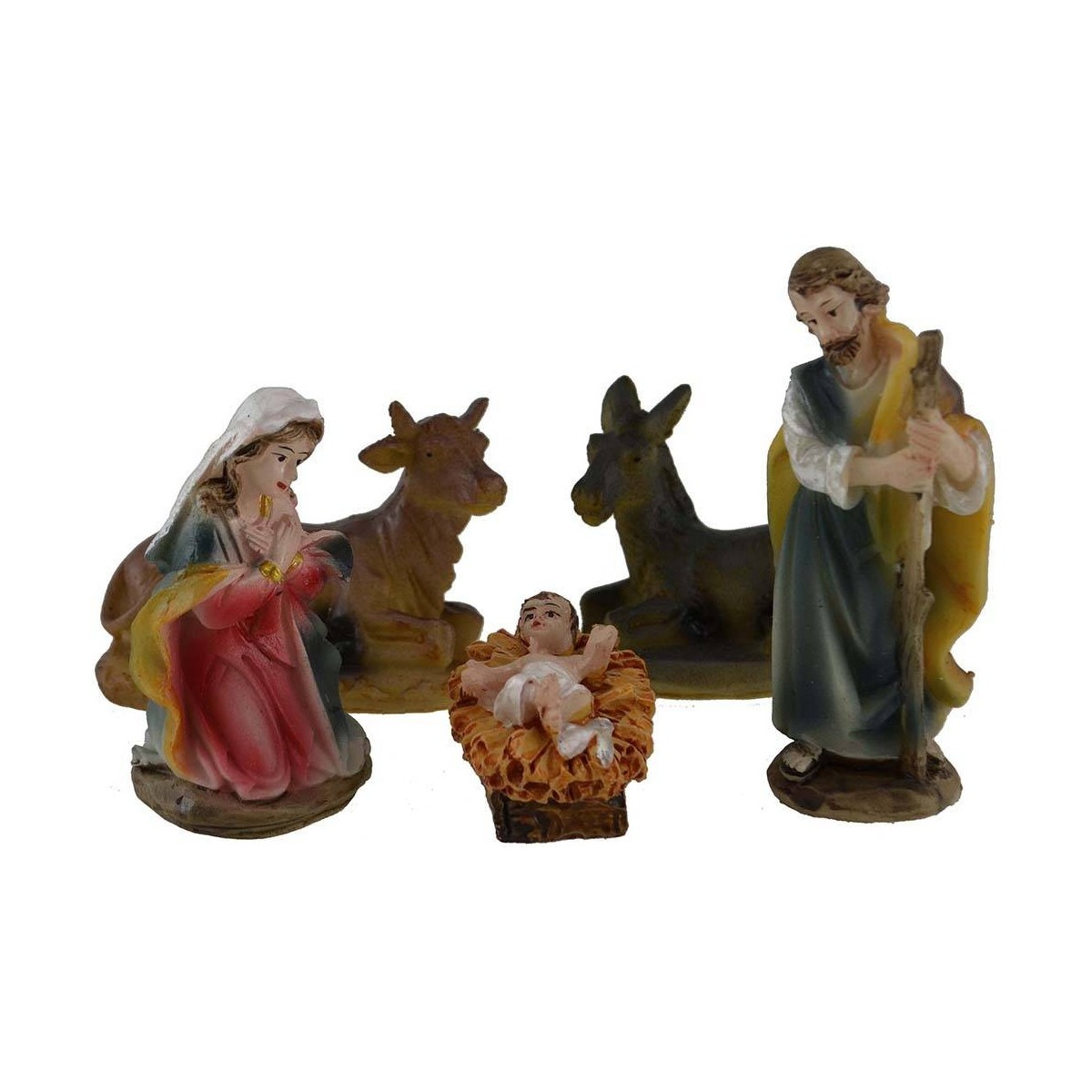 Juego de 10 piezas compuesto por: San José, María, Jesús en la cuna, buey, burro, tres Reyes Magos, pastor y oveja. Figuras para belén pintadas en resina, altura 8 cm.