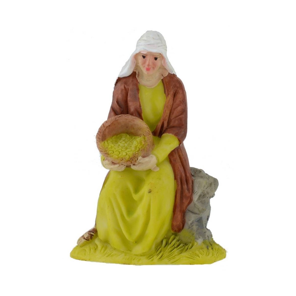 Aldeana sentada en un muro con cesta de trigo, altura 9 cm en resina.