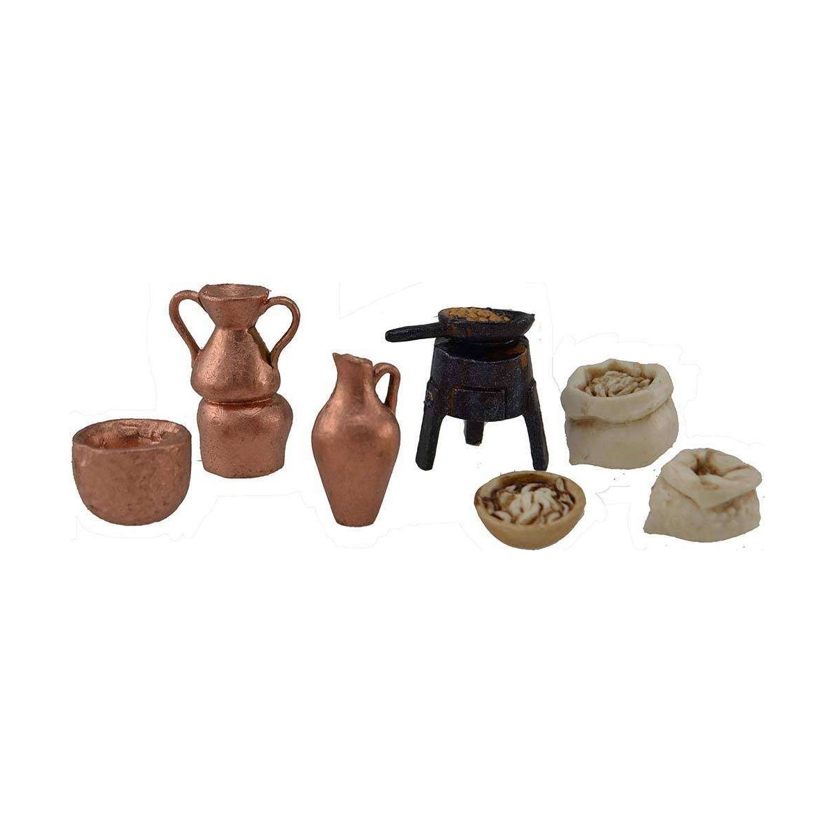 Bolsa de 7 miniaturas de Landi-Moranduzzo, el set incluye: 3 ánforas de cobre, 2 sacos, 1 cuenco, 1 caldera para castañas asadas.