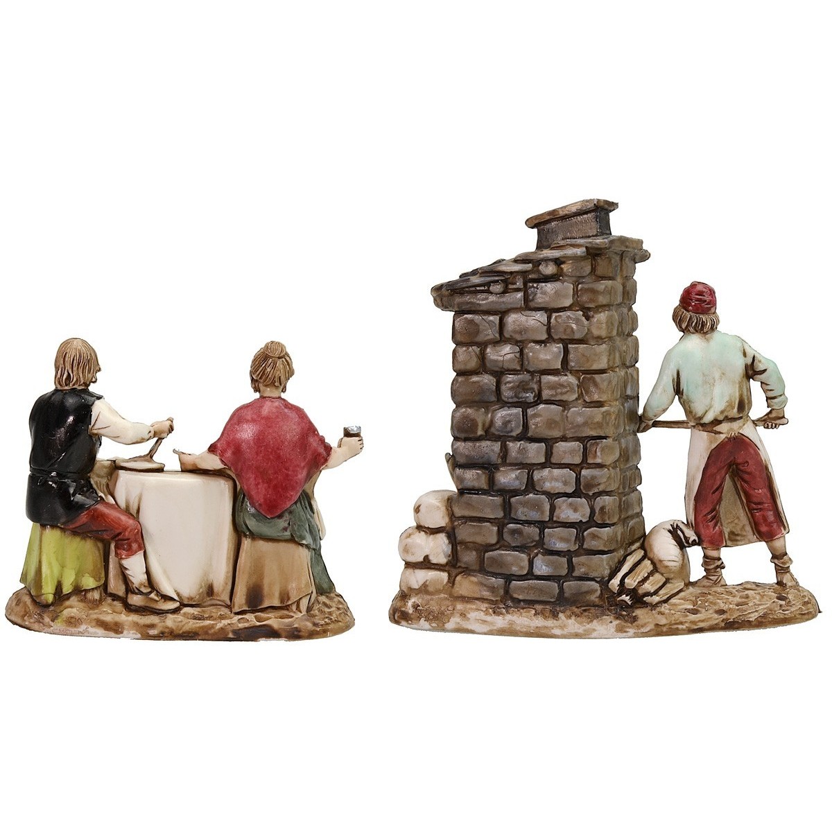 Dos escenas Landi Moranduzzo serie 8 cm, la altura real de las estatuas es de 7,5 cm. El set está compuesto por un panadero y una pareja en la mesa.