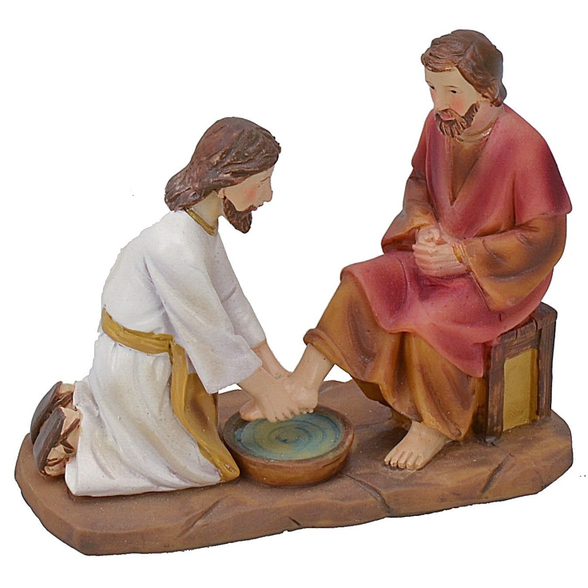 Conjunto de figuras para la representación del Lavado de pies de Jesús. Las estatuas de la misma serie de 9 cm tienen rostros expresivos y bien detallados y están realizadas completamente en resina. El producto es ideal para la creación de composiciones pascuales como dioramas y belenes.