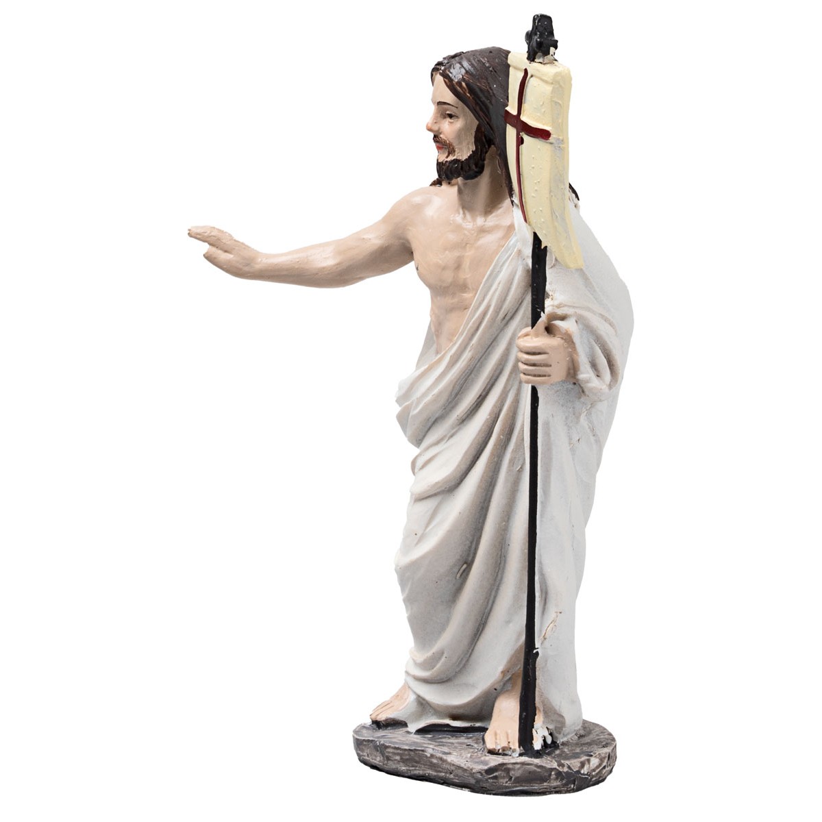 Conjunto de Pascua en resina compuesto por figuritas de 10 cm de altura que representan la escena de la Resurrección: Jesús resucitado, María Magdalena, el ángel y el sepulcro vacío con la piedra rodada.