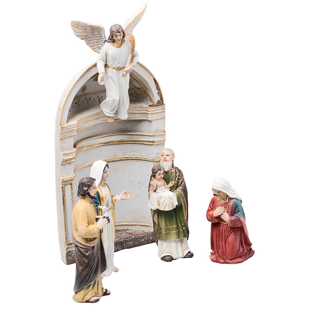 El conjunto incluye 6 sujetos: el ángel, María, José, una niña, una mujer arrodillada y la estructura del templo como fondo.