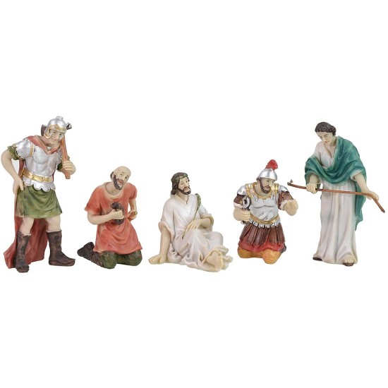 Conjunto de 5 estatuas de Pascua para la representación de la coronación de espinas de Jesús, poco antes de su condena a muerte, a manos de los soldados romanos. Los soldados se divirtieron humillándolo, colocándole en la cabeza una corona tejida de espinas y, posteriormente, vistiéndolo con un manto púrpura, burlándose del condenado escenificando la burlesca adoración de un rey. Episodio de la vida de Jesús. Las estatuas de la misma serie tienen rostros expresivos y bien detallados y están realizadas completamente en resina. El producto es ideal para la creación de composiciones de Pascua como Dioramas y Belenes.