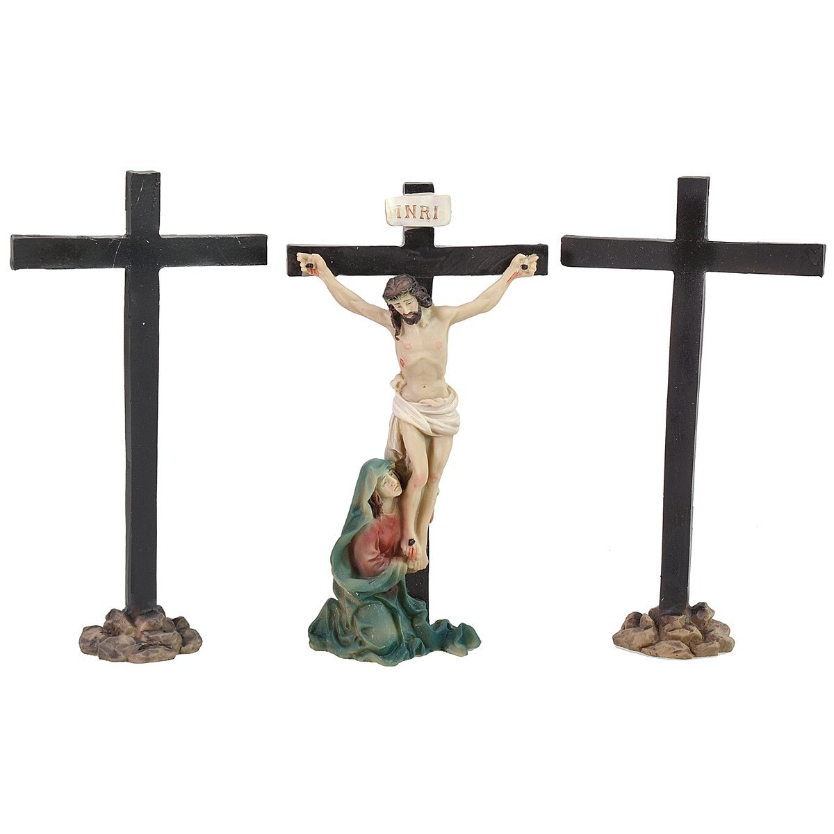 Juego de 6 Estatuas Pascuales para la representación de la Crucifixión de Jesús y de los 2 ladrones en el Monte Calvario, aún no condenados a muerte (como en la imagen, solo está presente su cruz). Las estatuas de la misma serie tienen rostros expresivos y bien detallados, y están hechas completamente de resina. El producto es ideal para la creación de composiciones Pascuales como Dioramas y Pesebres.
