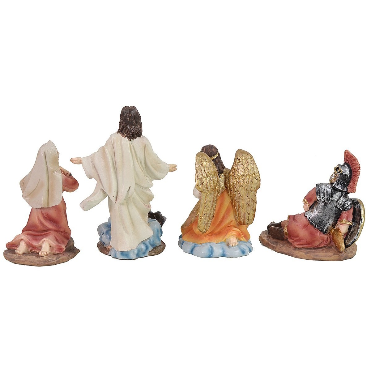 Estatuas Pascuales para representar la escena de la Resurrección de Jesús, compuesta por 4 figuras: guardia, María Magdalena, Cristo y el Ángel. Las estatuas de la misma serie tienen rostros expresivos y bien detallados, y están hechas completamente de resina. El producto es ideal para la creación de composiciones Pascuales como Dioramas y Pesebres.
