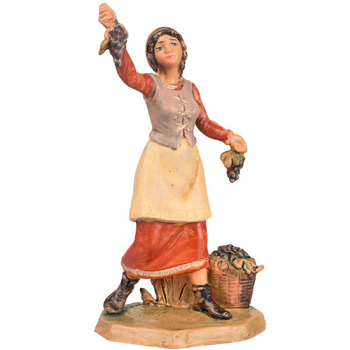Joven campesina con racimos de uva en la mano serie 9,5 cm Fontanini. Las estatuas del pesebre tradicional Fontanini son producidas y pintadas a mano en Italia, tienen rostros expresivos y detalles bien acabados.