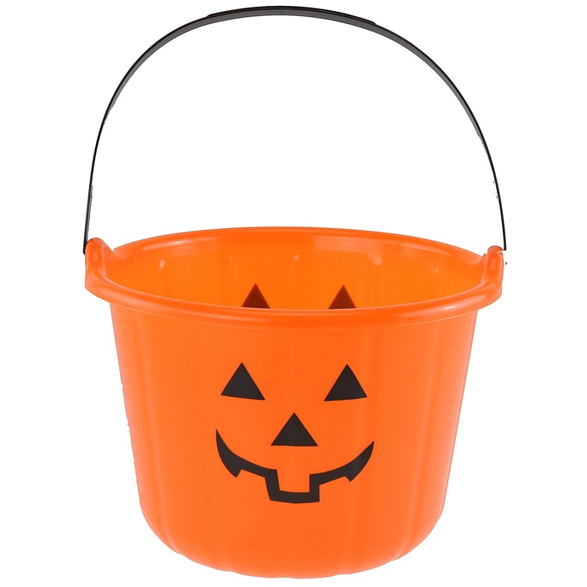 Cubo de plástico con calabaza para recoger dulces en la noche de Halloween.