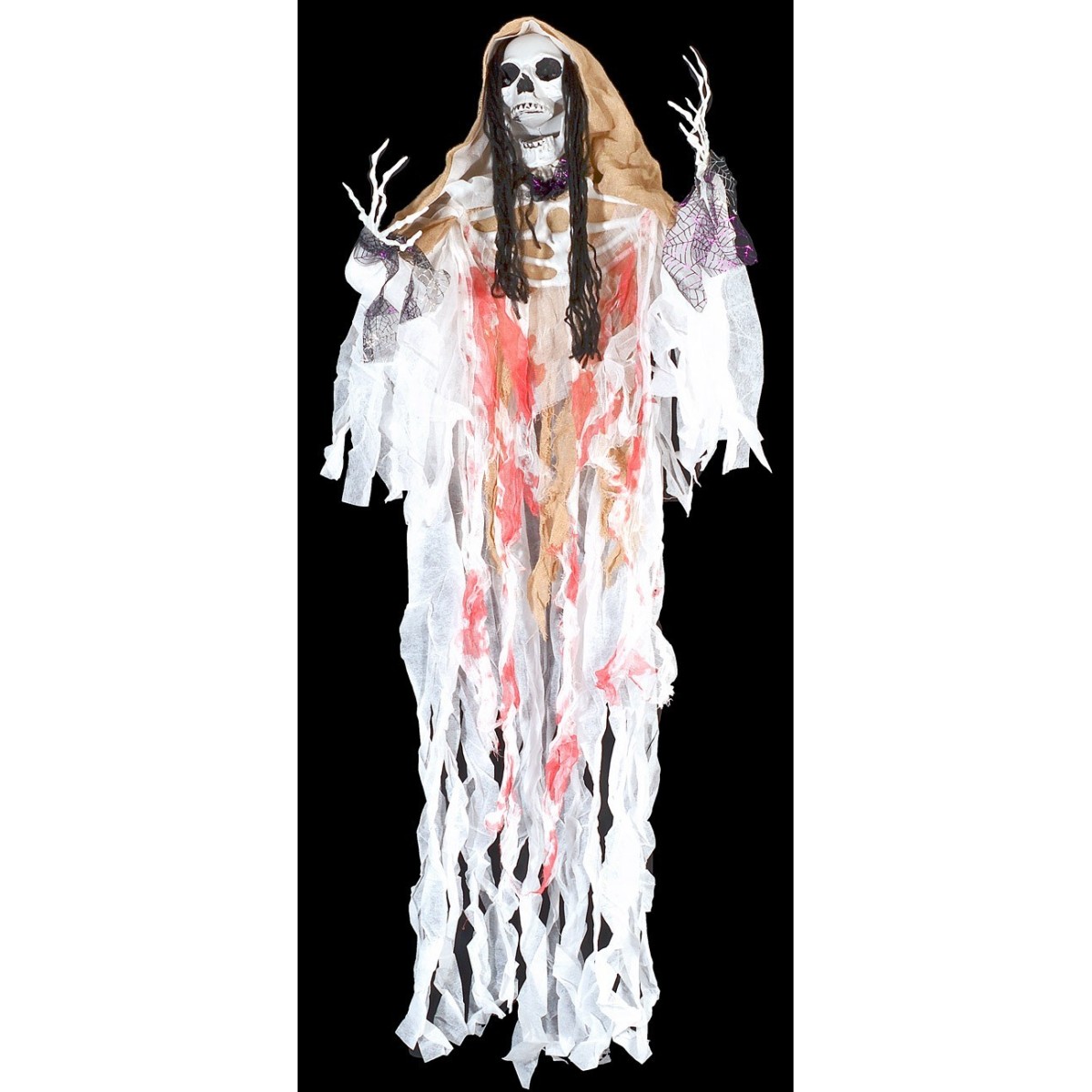 Monstruo con tocado de cuerda, ojos rojos que parpadean y sonido de lamentos macabros. Funciona con baterías (incluidas y reemplazables) con brazos que se pueden posicionar según las necesidades para escenarios de Halloween. Se informa que el video cargado, aunque no es del producto aquí presente, refleja los mismos ojos rojos parpadeantes y el mismo sonido.