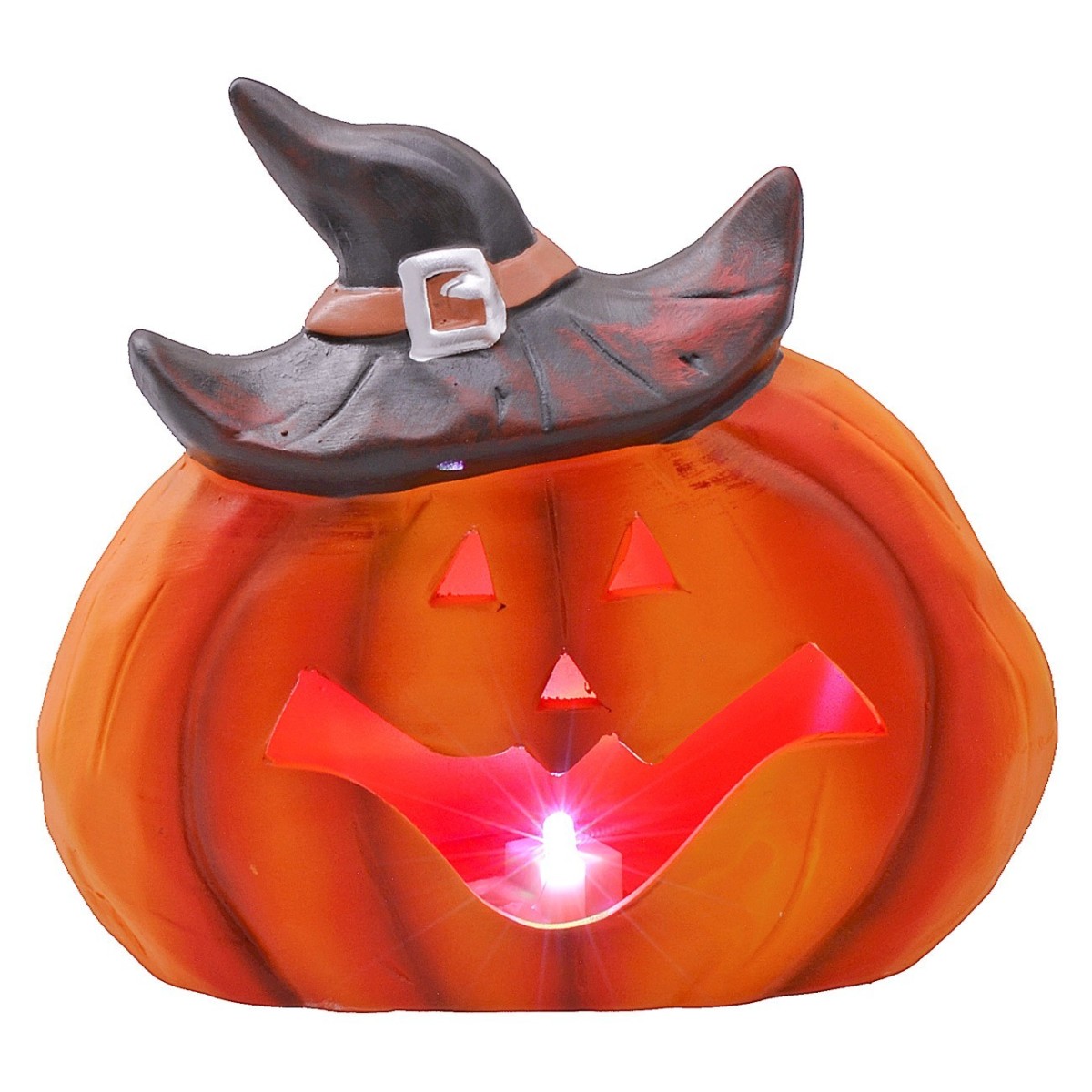 Calabaza de cerámica para Halloween con sombrero de bruja y led rgb que cambia de color, funciona con pilas (incluidas y reemplazables).