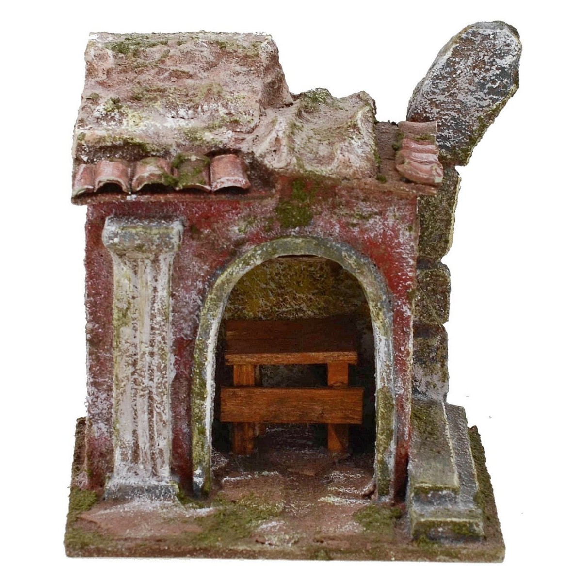 Taller para artesano con ruina de arco de piedra, desde la entrada con arco se ve el banco de trabajo o donde exponer la mercancía para vender, el ambiente puede ser decorado a gusto con las miniaturas presentes en la categoría. A la derecha, un viejo fragmento de columna acanalada en piedra clara, el techo está hecho de roca y decorado con tejas. Este artículo ha sido creado por artesanos italianos para el Belén clásico popular en poliestireno y madera, la estructura es adecuada para estatuas de altura 5-6 cm.