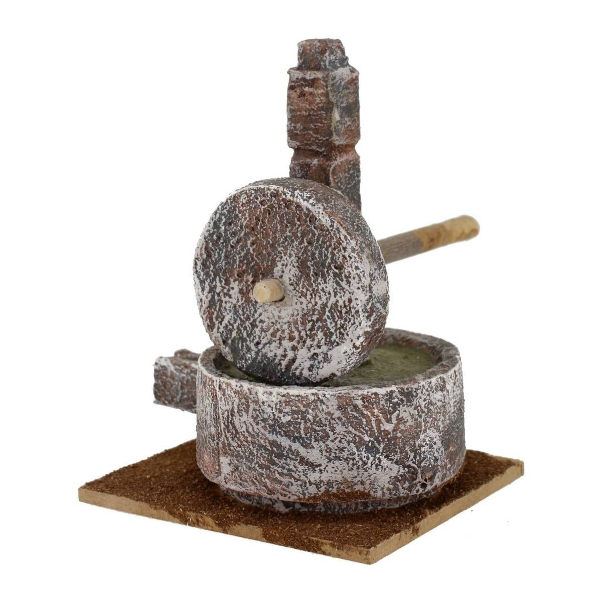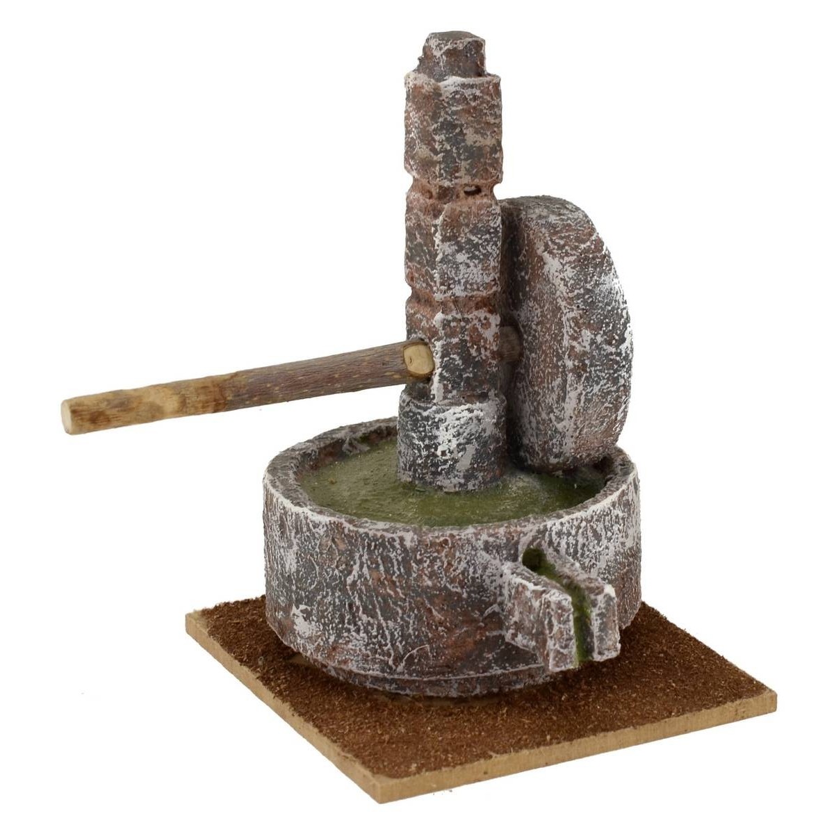 Molino artesanal para la extracción de aceitunas realizado en poliestireno, madera, corcho y musgo, recomendado para estatuas de 10 cm de altura.
