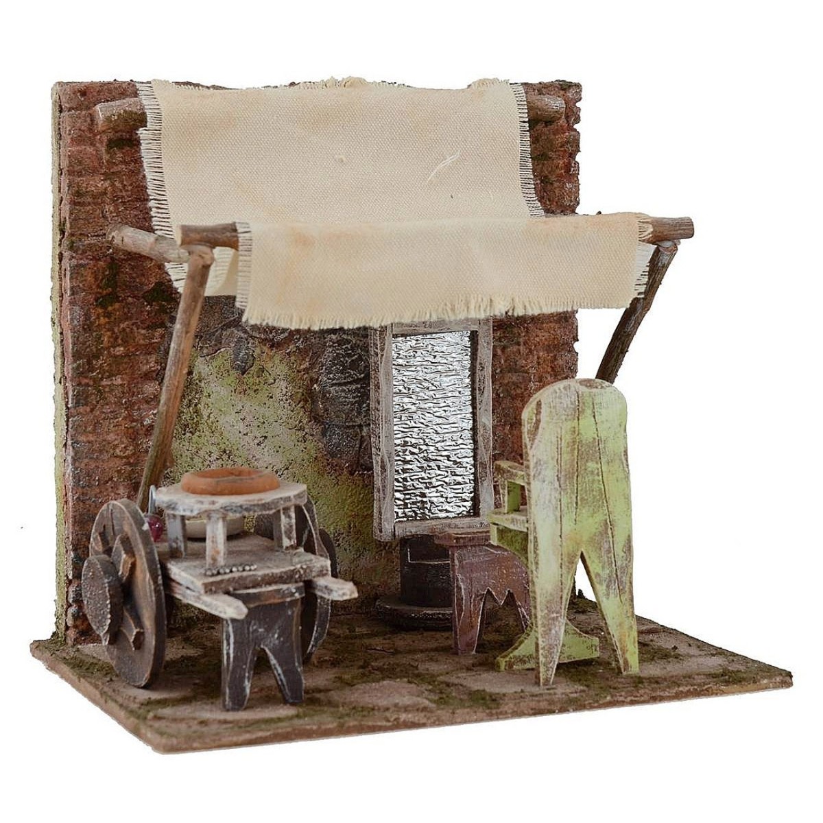 Barbería para belén en poliestireno y madera, en primer plano un taburete, frente a un espejo, donde acomodar a los clientes; a la izquierda un carrito donde se guardan algunas herramientas del oficio. La pared trasera se caracteriza por ladrillos a la vista con cortina, todo apoyado sobre un panel de piedras grandes para pavimentación. Recomendada para estatuas de altura 8-10 cm.