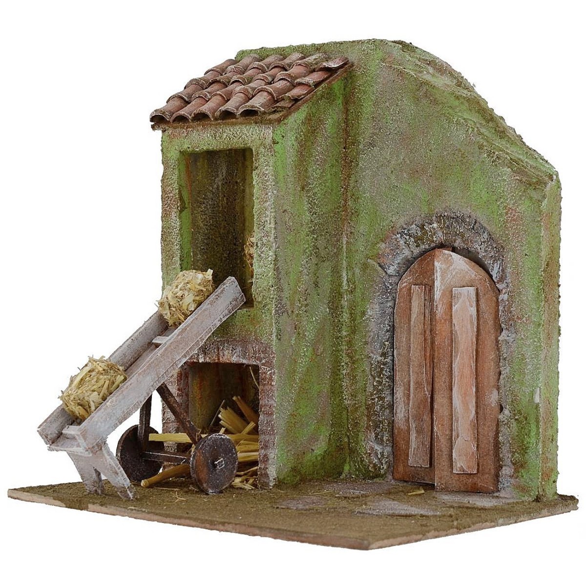Granero de dos niveles con cinta transportadora para cargar las pacas de heno al piso superior, al lado un gran portón que da al exterior del patio. Artículo muy original y de excelente fabricación realizado por hábiles artesanos italianos para el Belén clásico popular en poliestireno y madera; la estructura es adecuada para estatuas de altura de 12 cm.