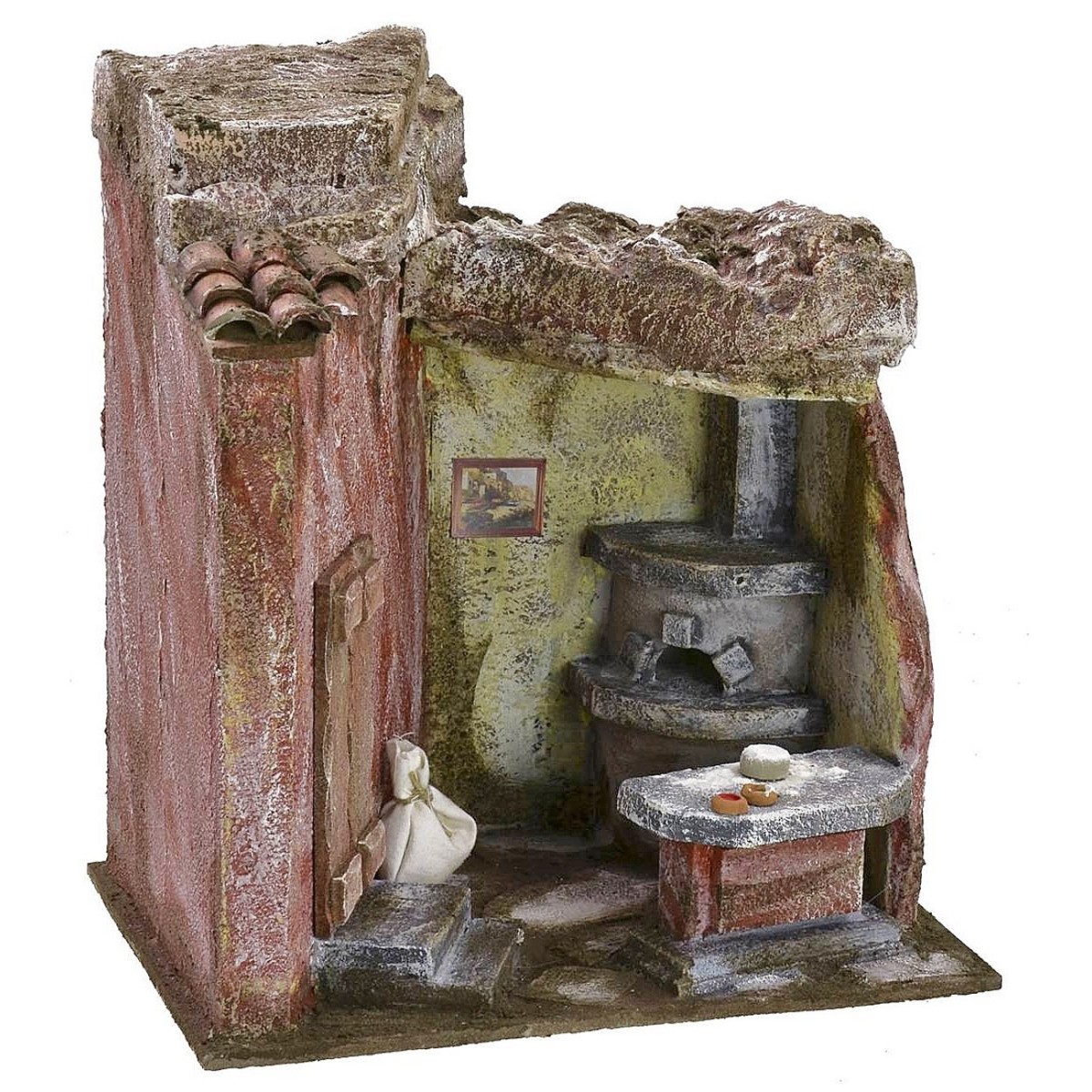 Taller del panadero con banco para amasar las pizzas, seguido por un horno de leña de 3 pisos; a la izquierda, una puerta con hojas de madera cerradas a la que se accede por algunos escalones de piedra. El techo está incrustado en la pared rocosa y solo se ve un indicio inicial de tejas. Esta ambientación para el Belén clásico popular ha sido realizada por hábiles artesanos italianos en poliestireno y madera. Se recomienda combinar el producto con estatuas de 12 cm, algunas de las cuales se proponen en los productos relacionados.