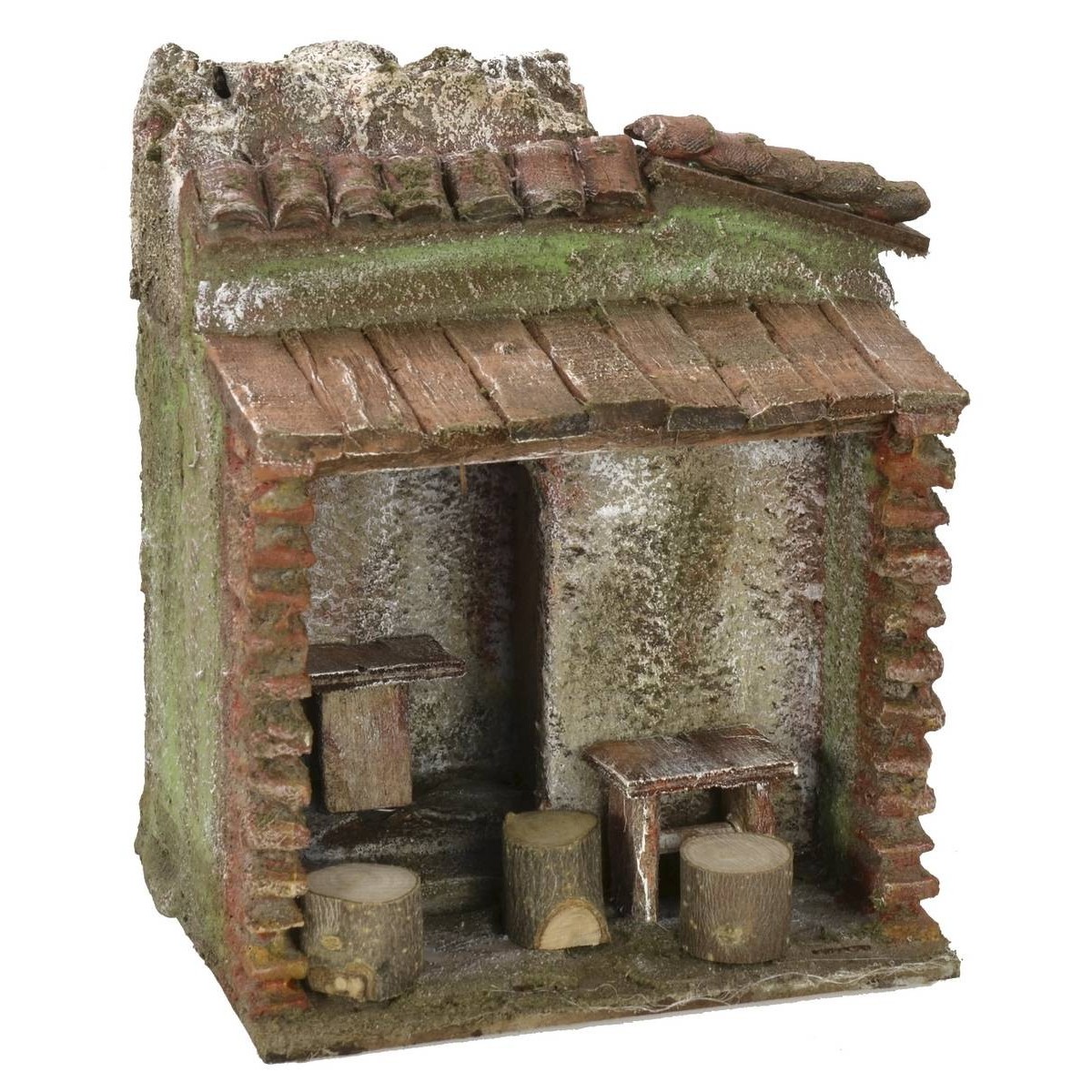 Osteria para el Pesebre clásico popular con pérgola de madera, caracterizada por los interiores: hay dos mesas con tres troncos de madera como asientos. Este escenario ha sido realizado por hábiles artesanos italianos para el Pesebre clásico popular en poliestireno y madera; la escena es adecuada para estatuas de altura de 6 cm.