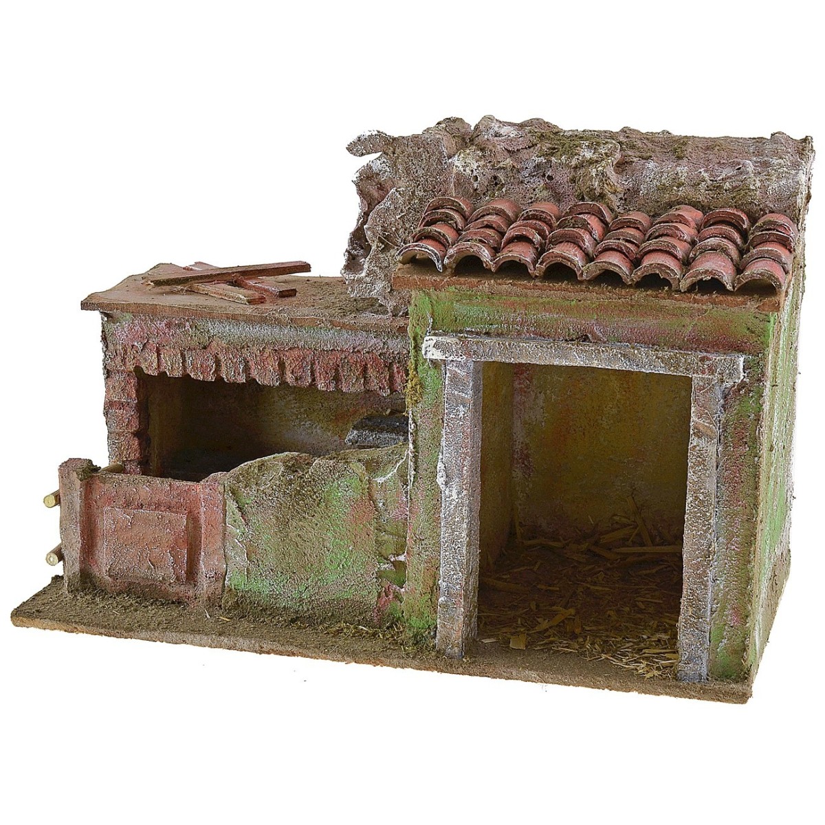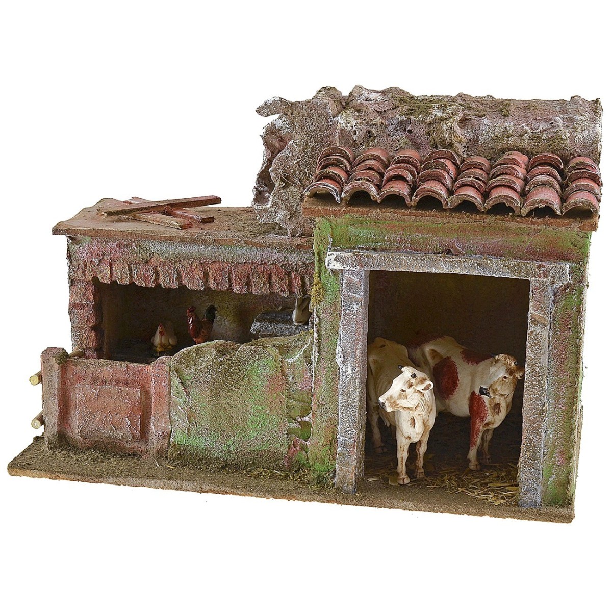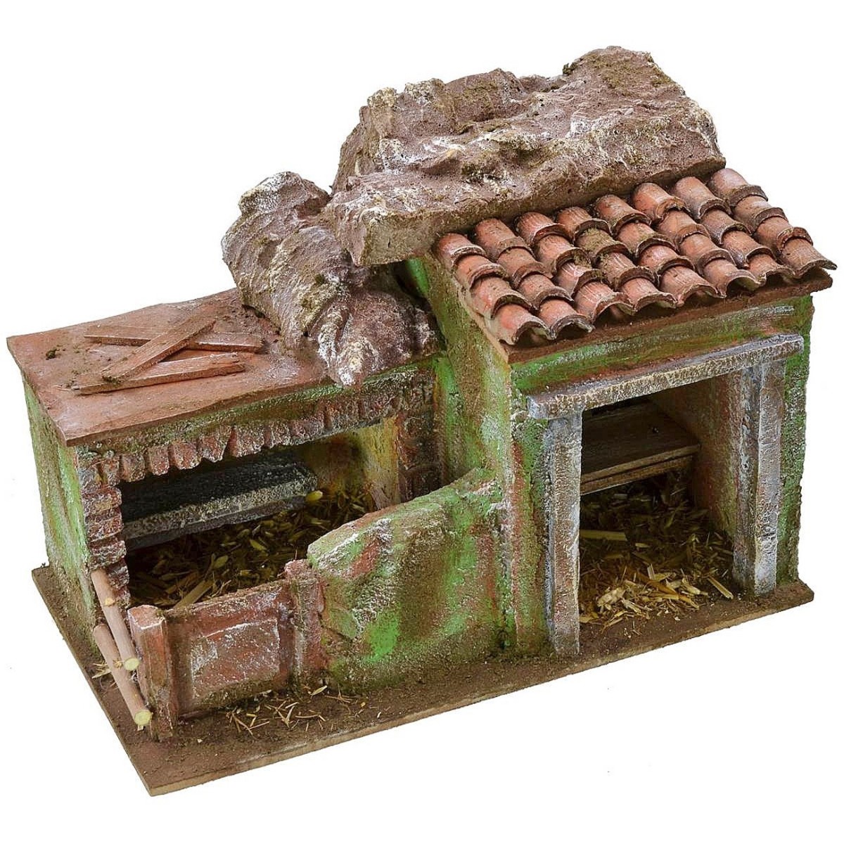 Doble establo para pesebre. A la izquierda el primer establo con cercado para animales; a la derecha encontramos el segundo establo con bancos donde es posible colocar heno. Esta ambientación ha sido realizada por hábiles artesanos italianos para el Pesebre clásico popular en poliestireno y madera; la estructura es adecuada para estatuas de altura de 10 cm, como se muestra en las imágenes demostrativas.