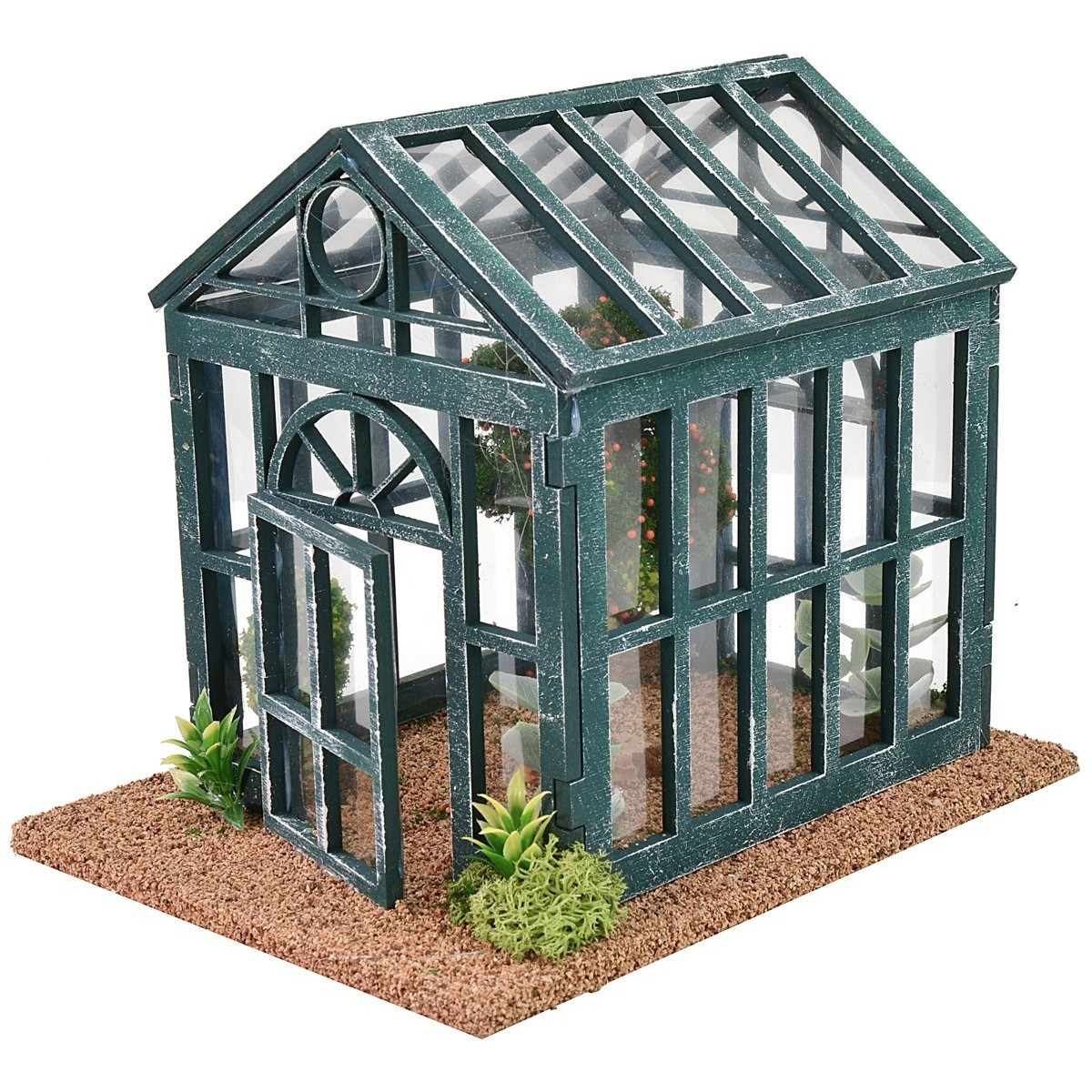 Invernadero para belén de vidrio con estructura de madera verde que crea un juego de formas geométricas, en el interior hay un gran árbol de naranjos y a los lados cuatro plantas, en el exterior dos pequeñas agaves a los lados. El artículo es muy bonito, bien acabado y producido en Italia.