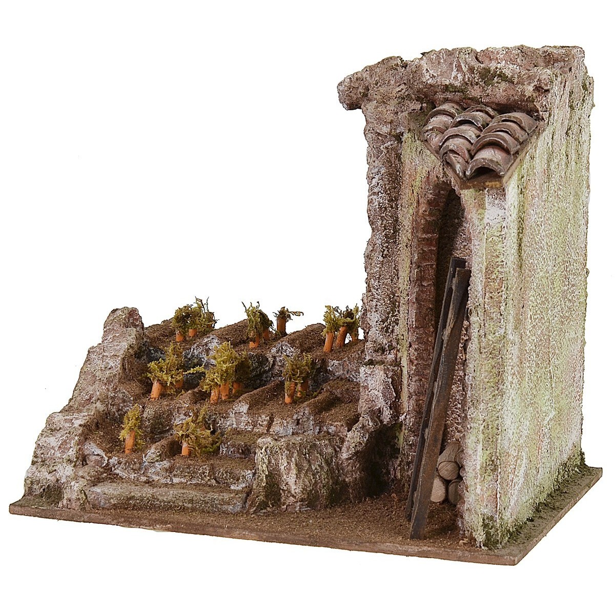 Campo aterrazado y bien ordenado cultivado con zanahorias, al lado un cobertizo donde se guardan una escalera y leña. El artículo es adecuado para estatuas de altura de 12 cm y ha sido creado por hábiles manos artesanas italianas en poliestireno y madera.