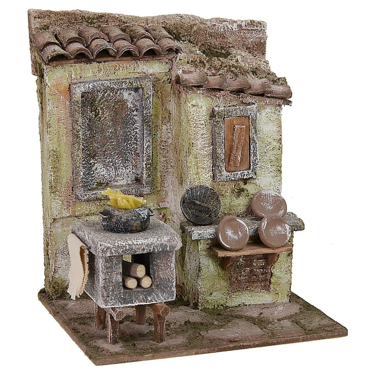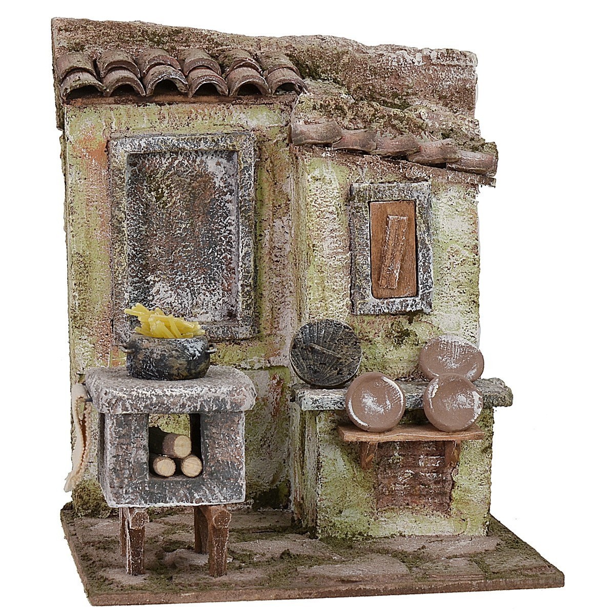 Ambientación del maccheronaio. Pieza muy particular para hacer único tu Belén, a la izquierda una cocina de leña con la que se cuece la pasta, mientras que a la derecha se exponen los platos que se utilizarán para el servicio. El artículo es adecuado para estatuas de altura de 12 cm y ha sido creado por sabias manos artesanas italianas en poliestireno y madera.
